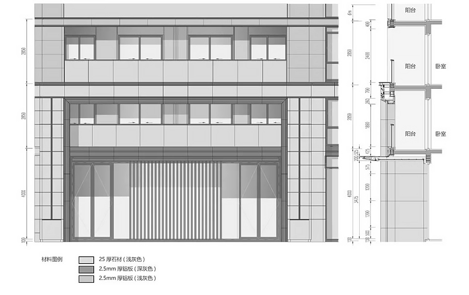 ▼主楼入口典型墙身,Typical wall body at main building entrance