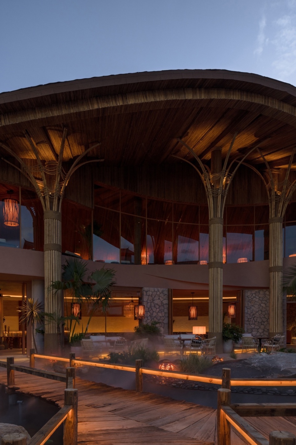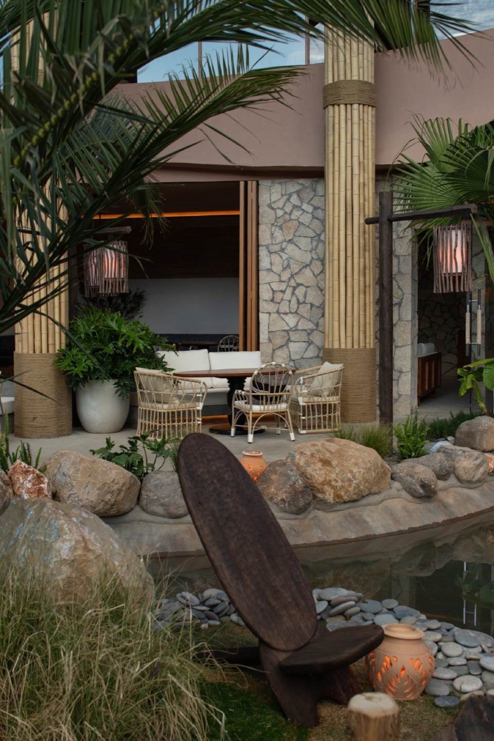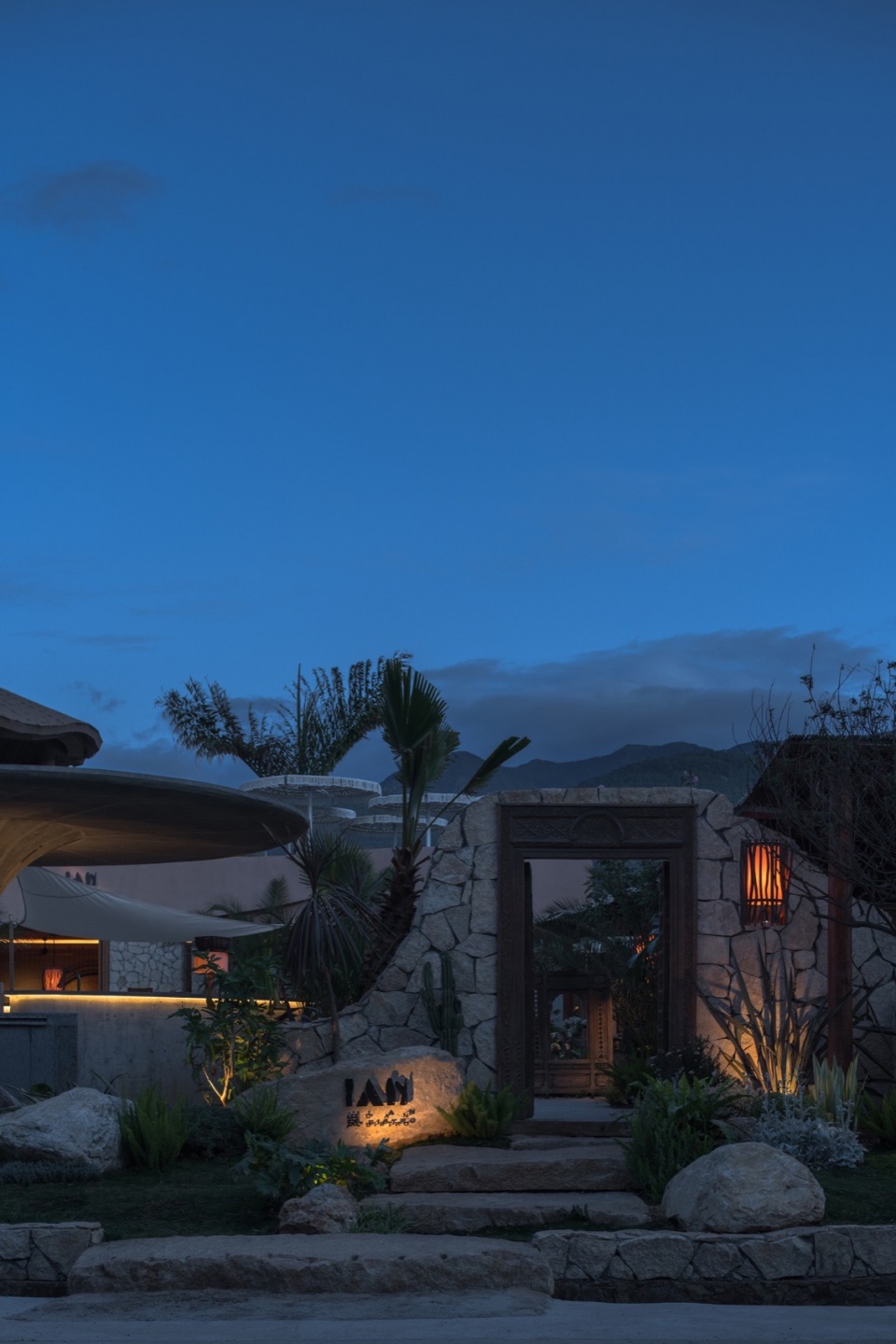 夜幕降临时,竹枝上的灯串随风轻晃,发出温暖黄光,倒映在如镜的池水中。铜制壁灯沿石墙分布,灯笼洒下的柔和光晕使整座建筑显得温暖明亮。