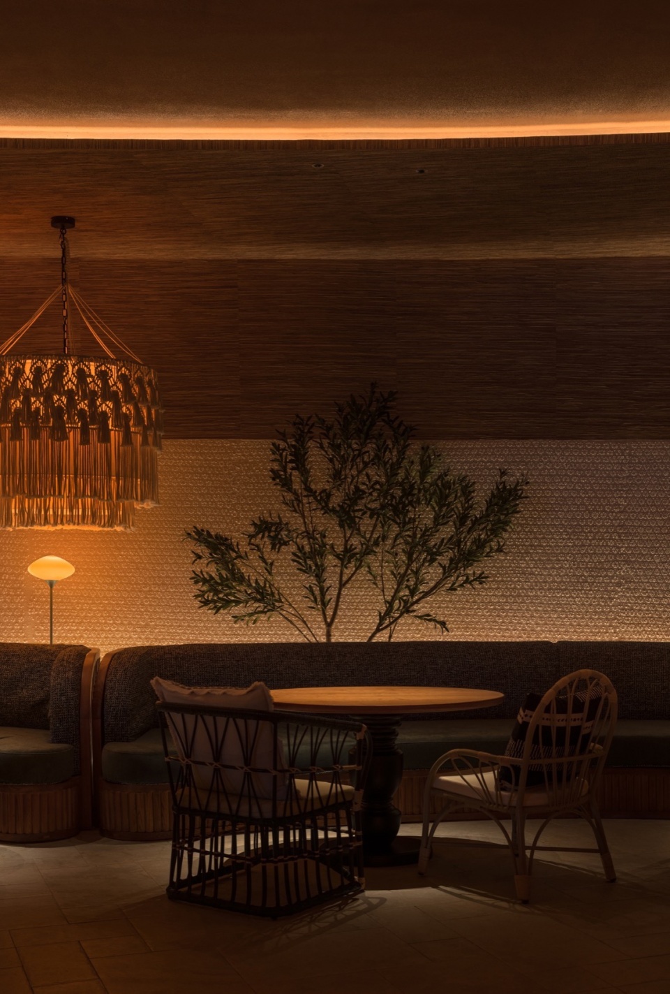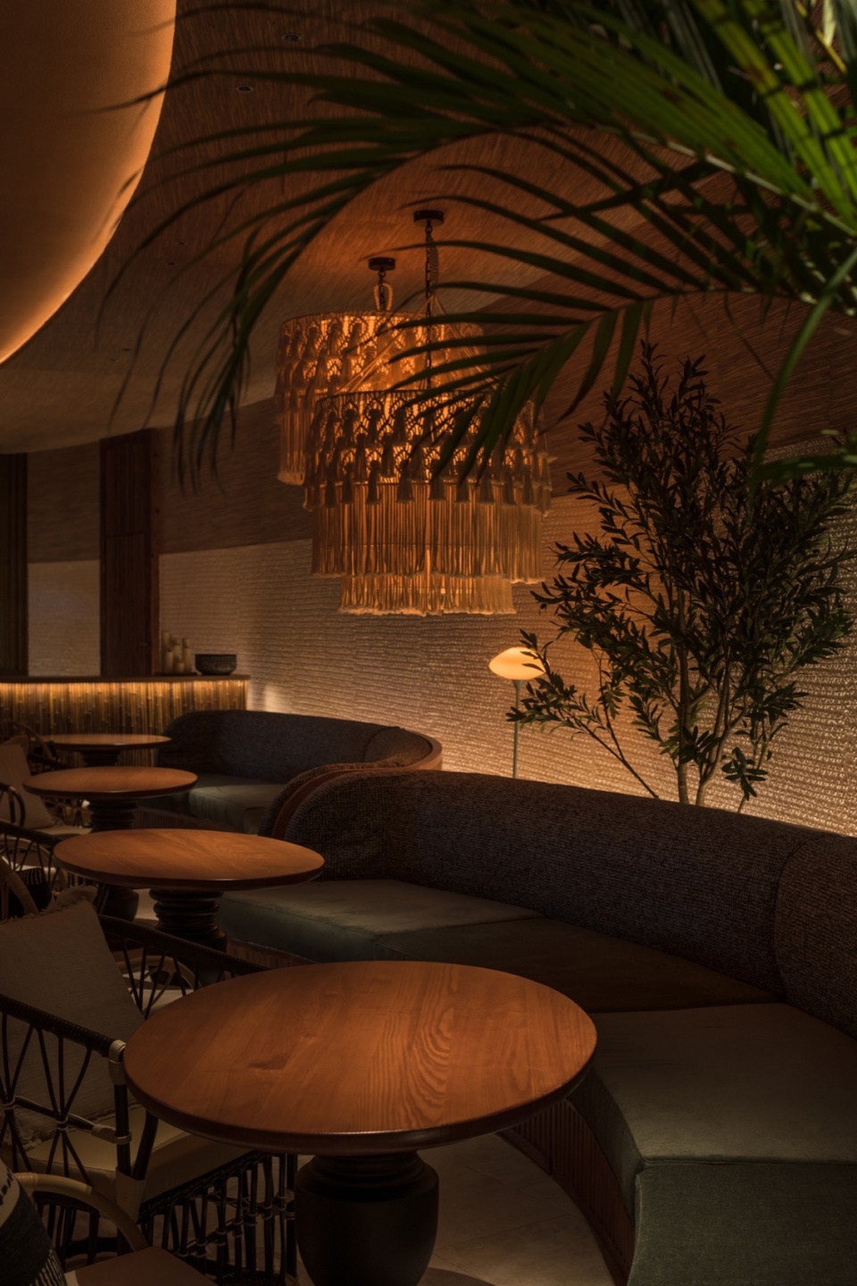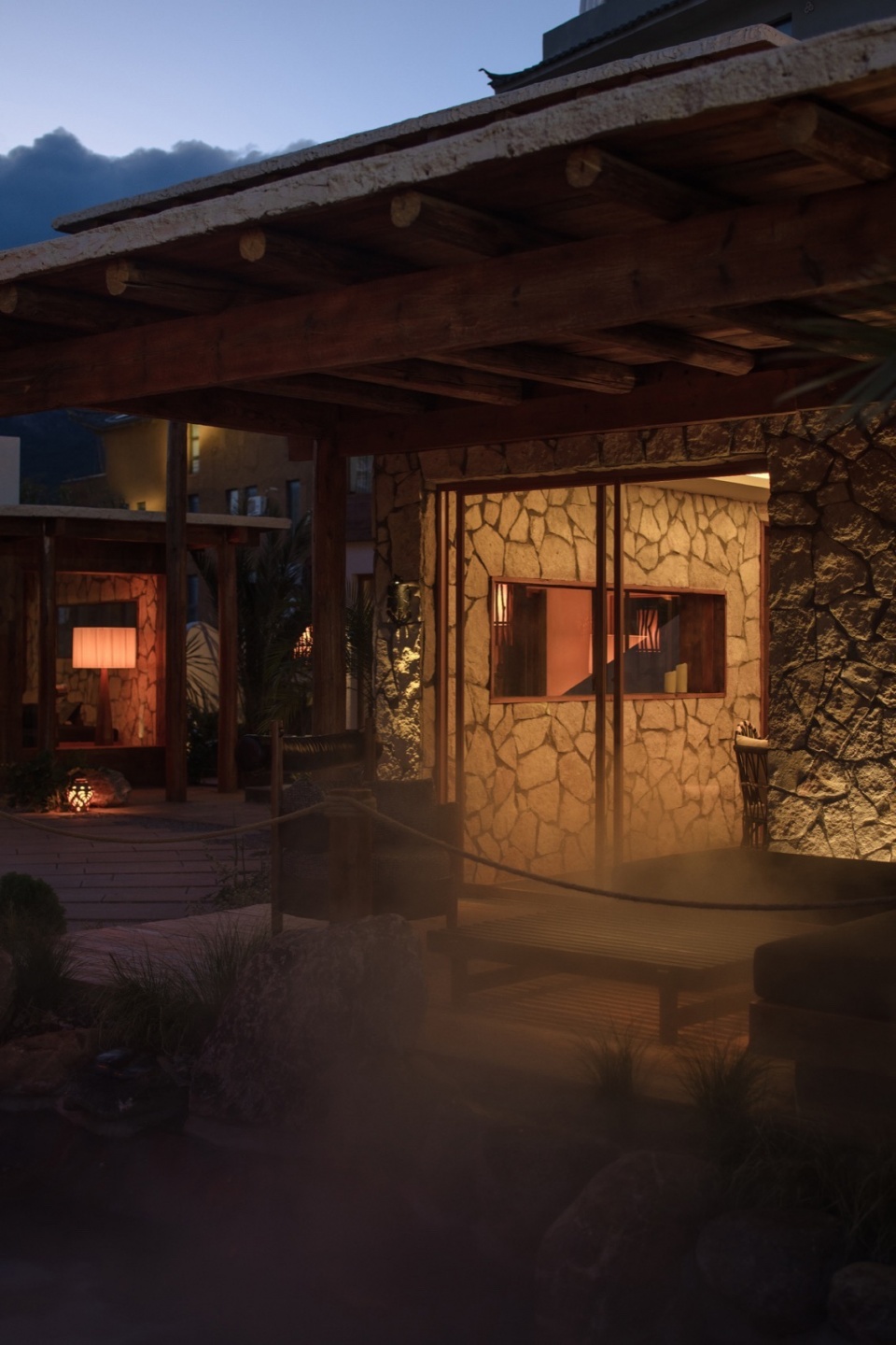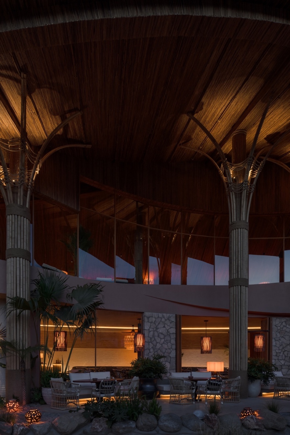 夜幕降临时,竹枝上的灯串随风轻晃,发出温暖黄光,倒映在如镜的池水中。铜制壁灯沿石墙分布,灯笼洒下的柔和光晕使整座建筑显得温暖明亮。