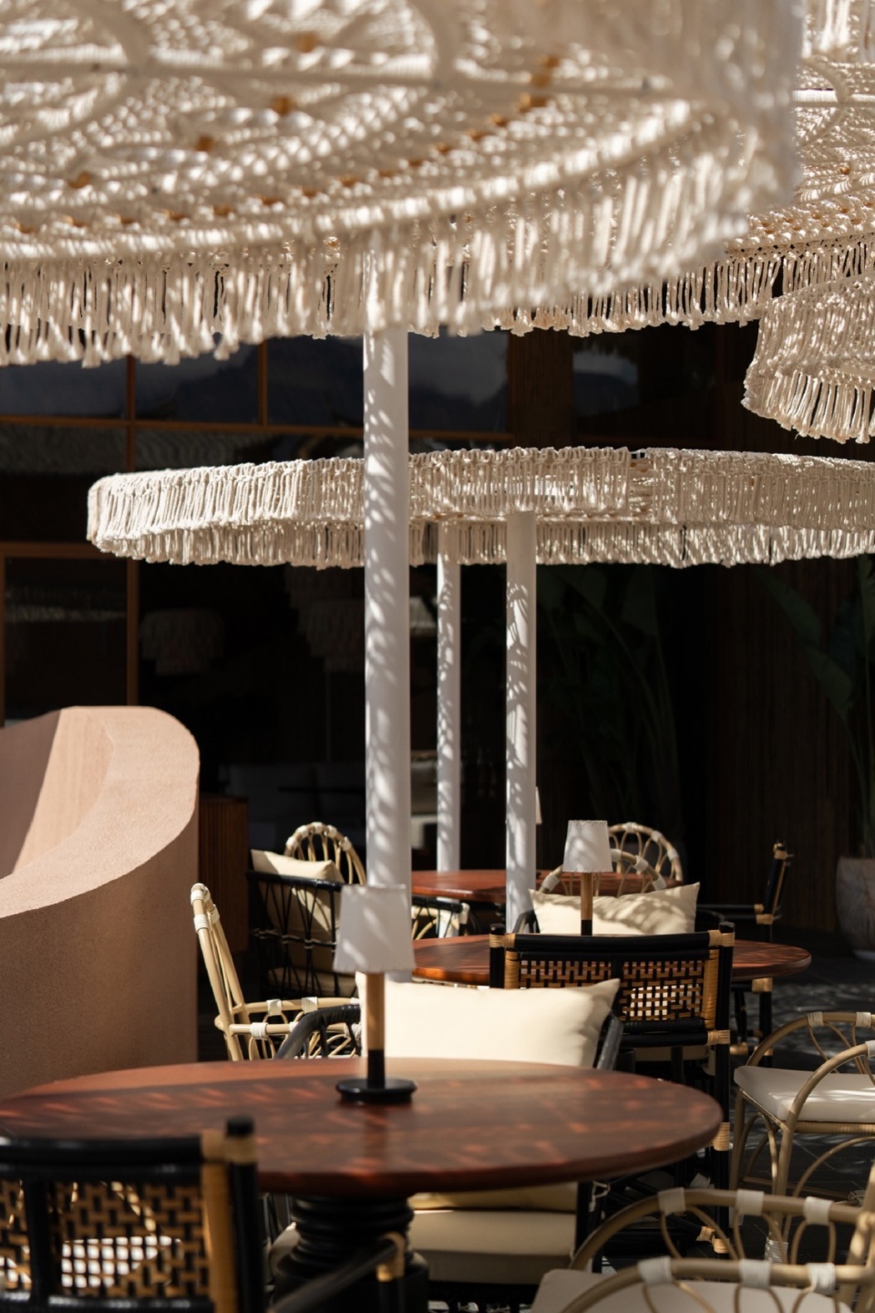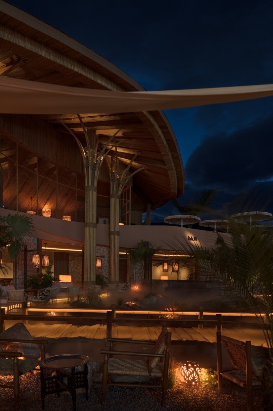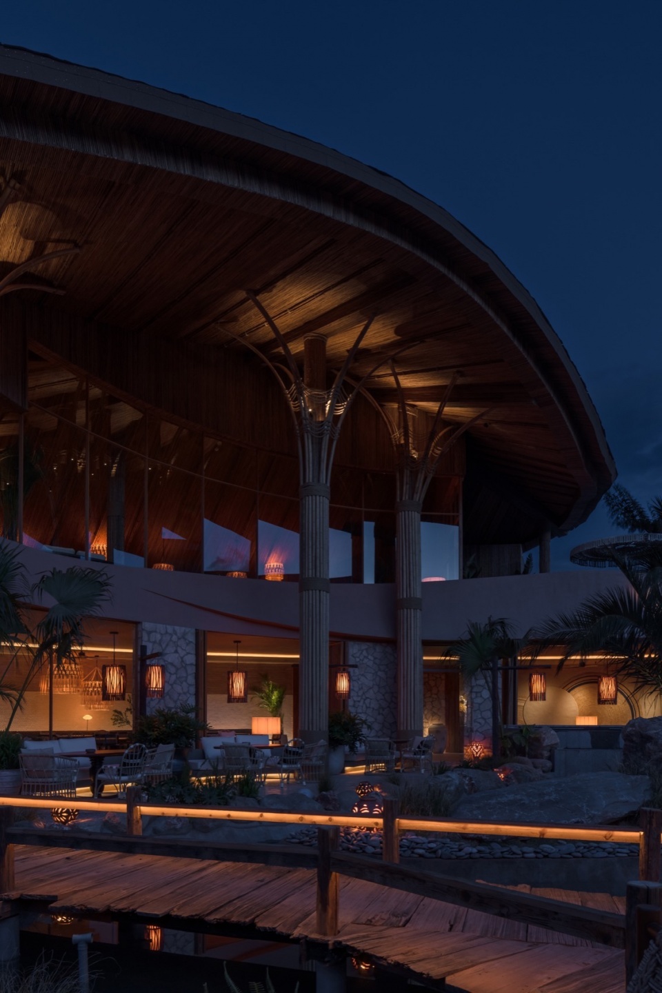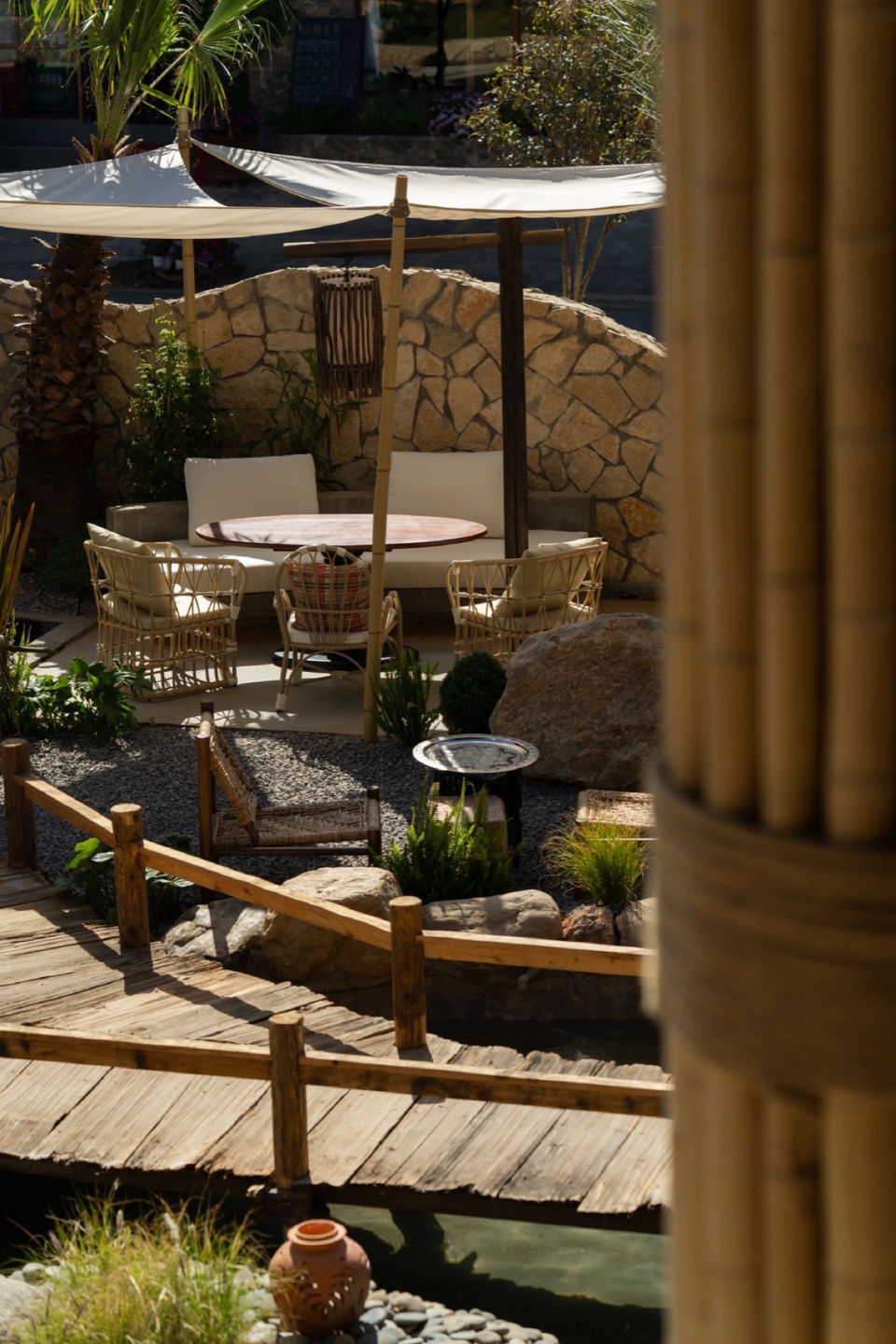 木桥串联起不同功能区域,绿植和手工遮阳伞共同形成半围合的灰空间。这种设置不仅突破了传统院落的内向封闭性,还赋予餐厅全时段运营模式的灵活性。白天是开放市集,傍晚时切换为社交模式,夜晚则变成私密观景空间。