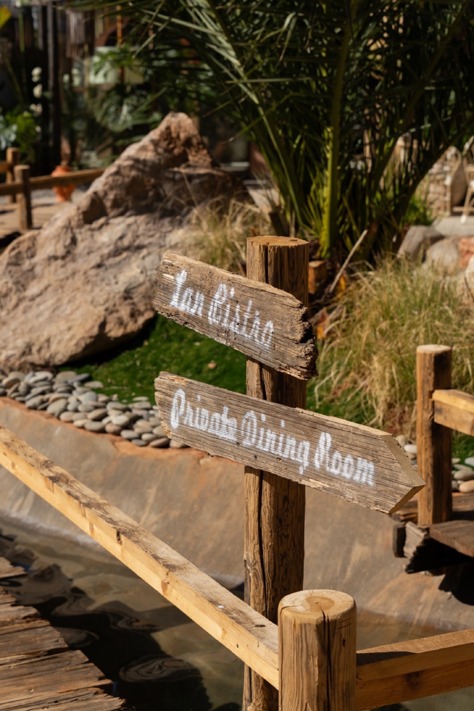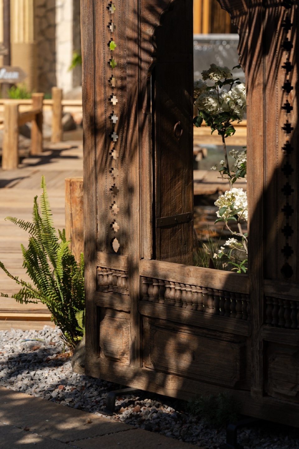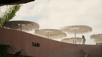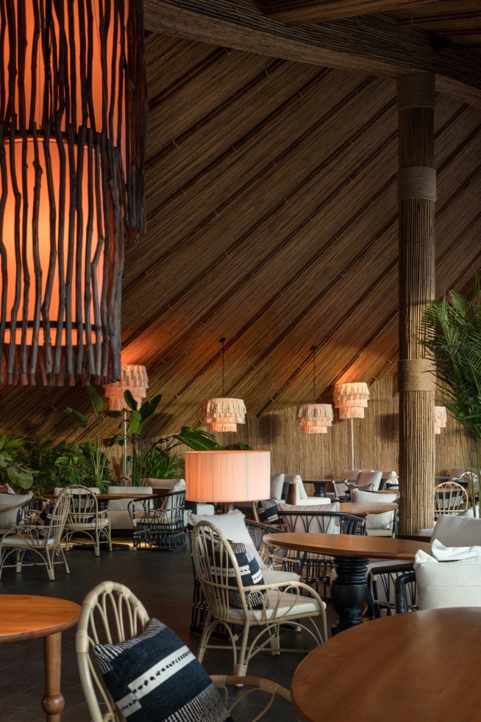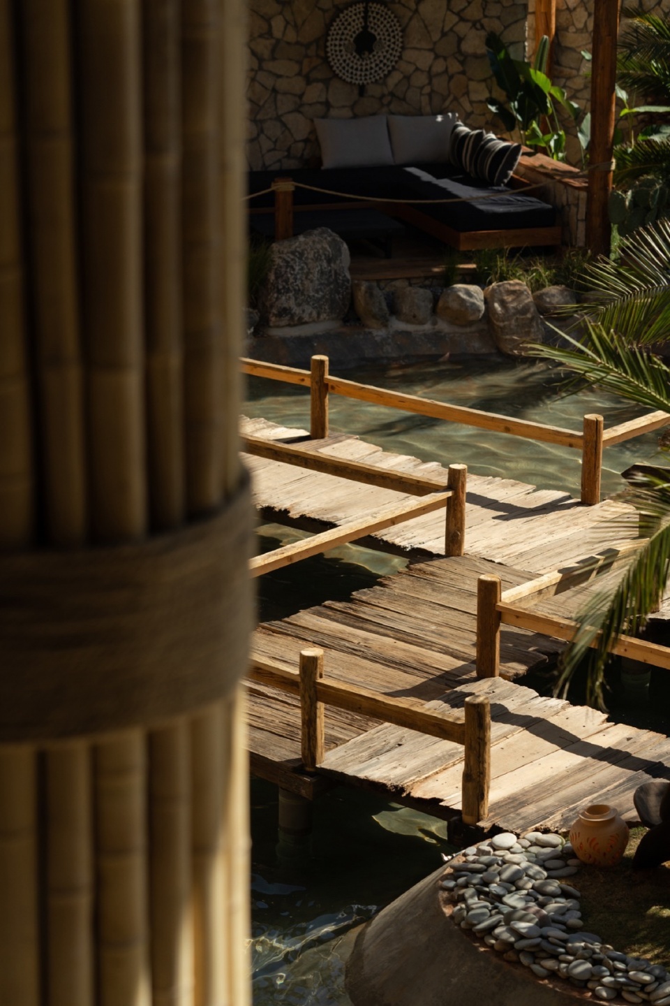 木桥串联起不同功能区域,绿植和手工遮阳伞共同形成半围合的灰空间。这种设置不仅突破了传统院落的内向封闭性,还赋予餐厅全时段运营模式的灵活性。白天是开放市集,傍晚时切换为社交模式,夜晚则变成私密观景空间。