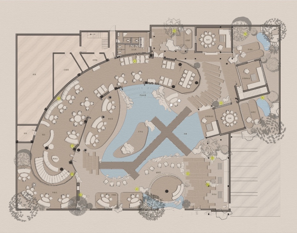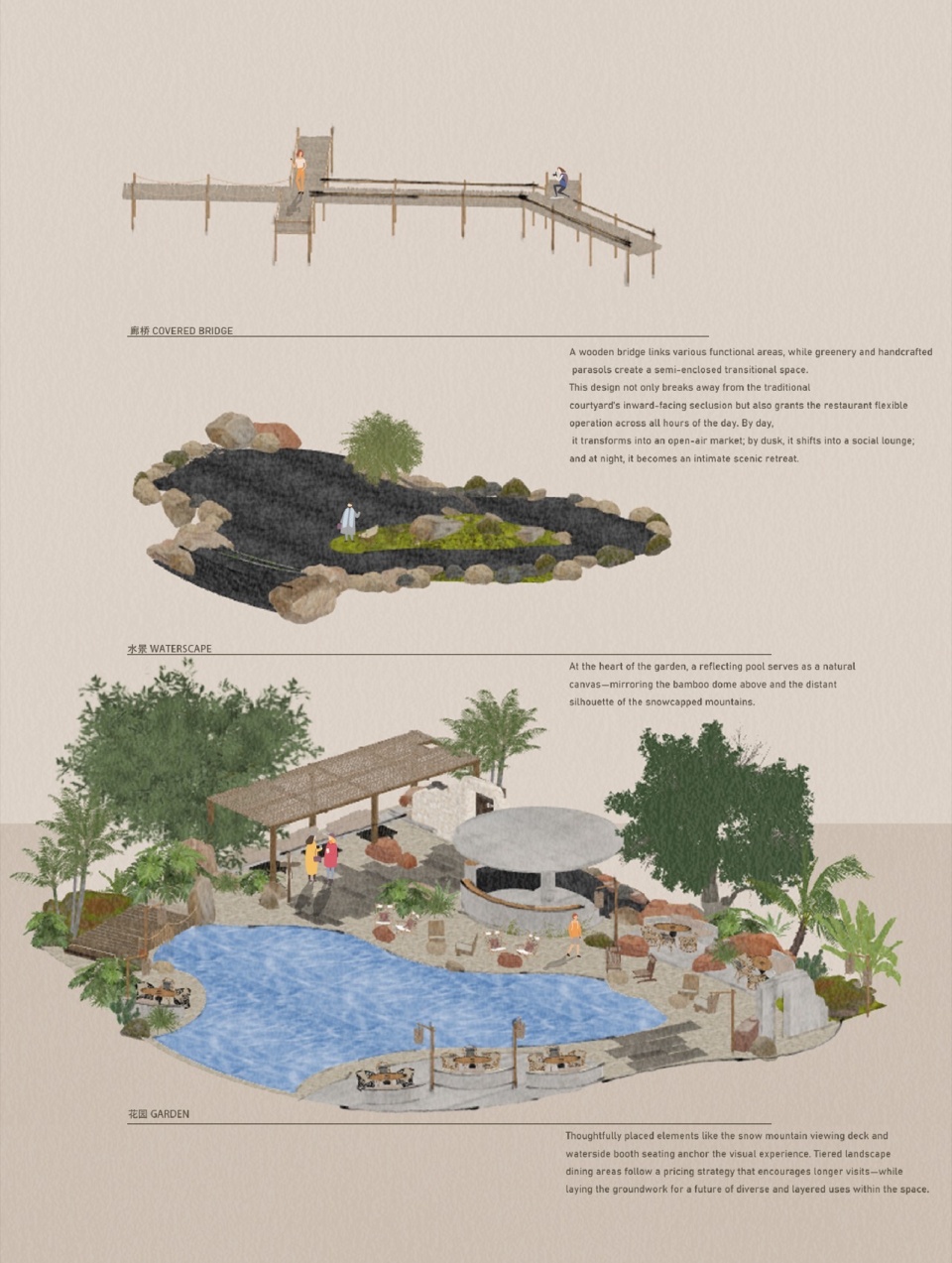 Thoughtfully placed elements like the snow mountain viewing deck and waterside booth seating anchor the visual experience. Tiered landscape dining areas follow a pricing strategy that encourages longer visits—while laying the groundwork for a future of diverse and layered uses within the space.