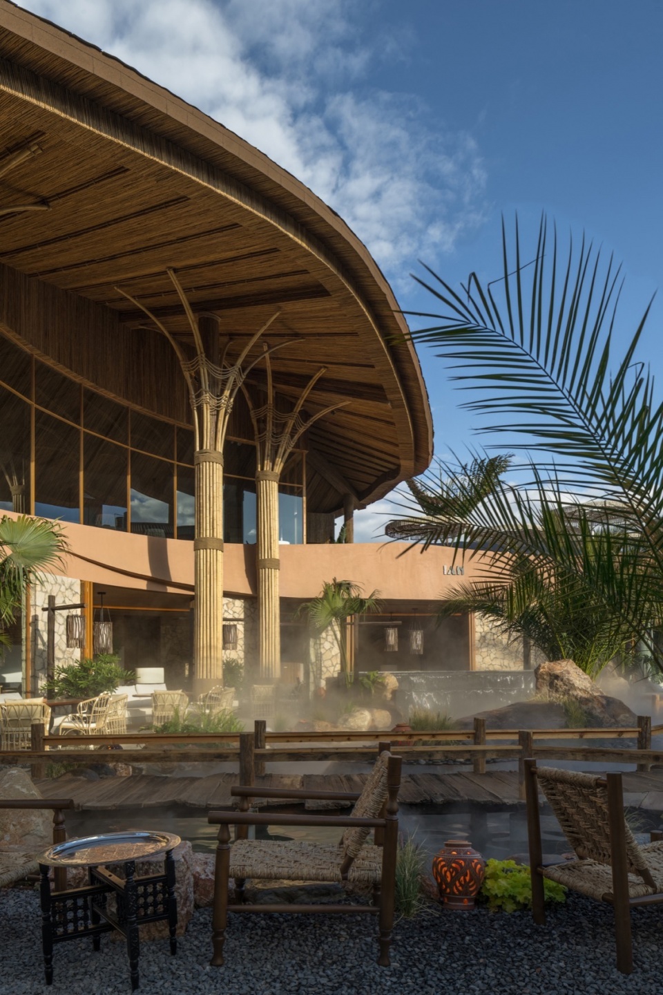 花园中心的水池,作为天然画布倒映着竹构穹顶与远处的雪山轮廓。