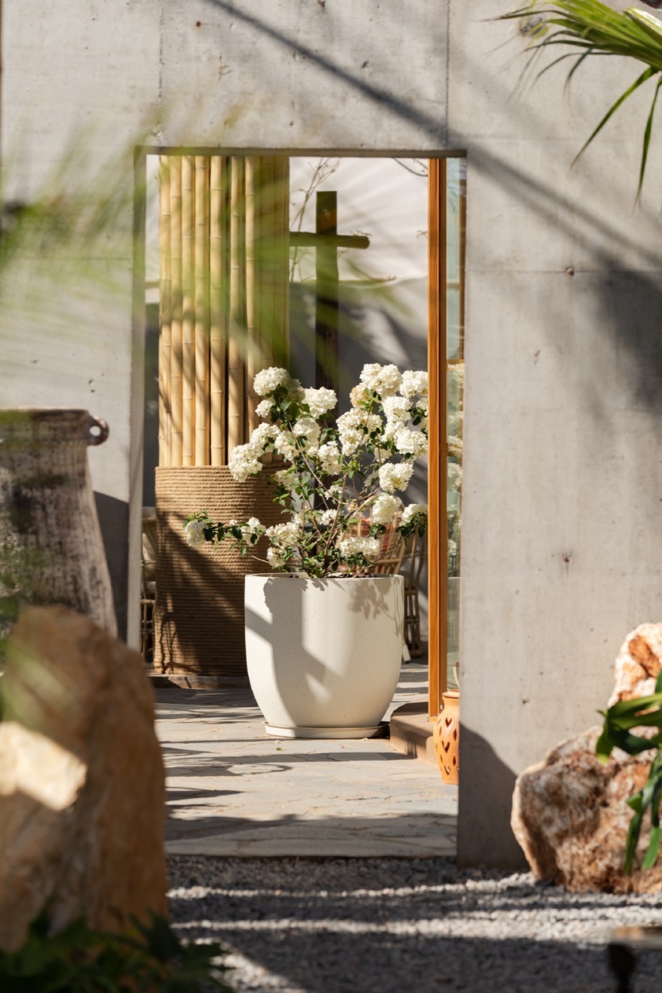 Fieldstone, bluestone slabs, reclaimed timber, and bamboo structures silently echo the historical texture of the ancient Tea-Horse Road. Sunlight filters through the bamboo canopy, scattering shifting patterns across the stone walls.