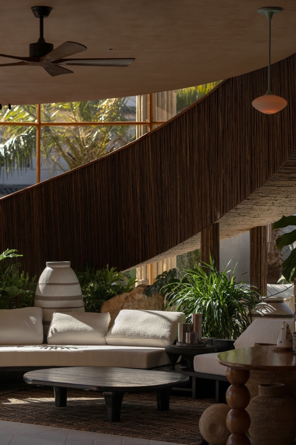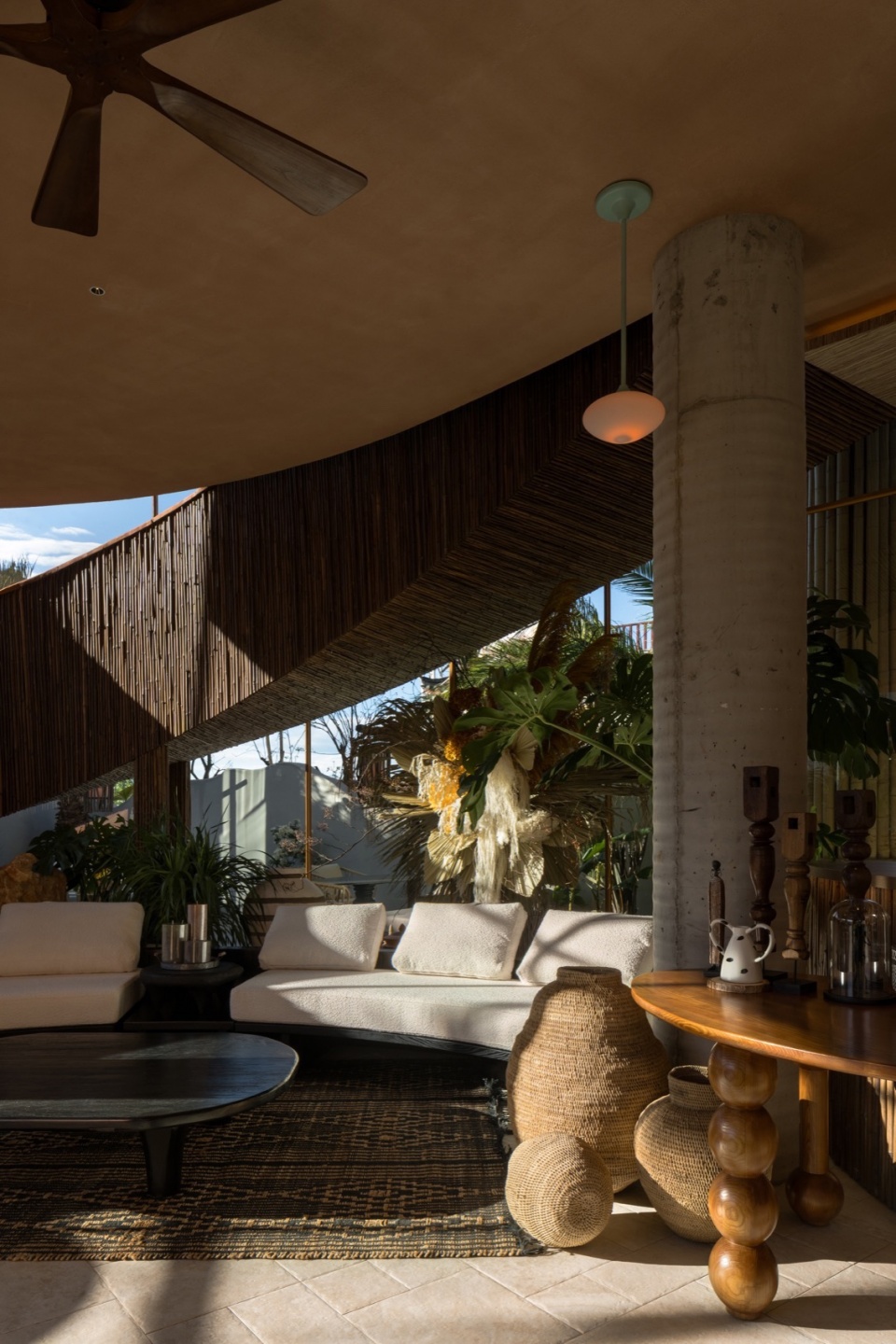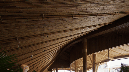 Beneath the woven bamboo curves lies a sturdy steel frame, hidden from view. Clusters of bamboo shoot up from the ground, piercing through the floor slabs with supple grace, holding aloft the second-floor bamboo canopy—as if the building itself were sprouting naturally from the earth.