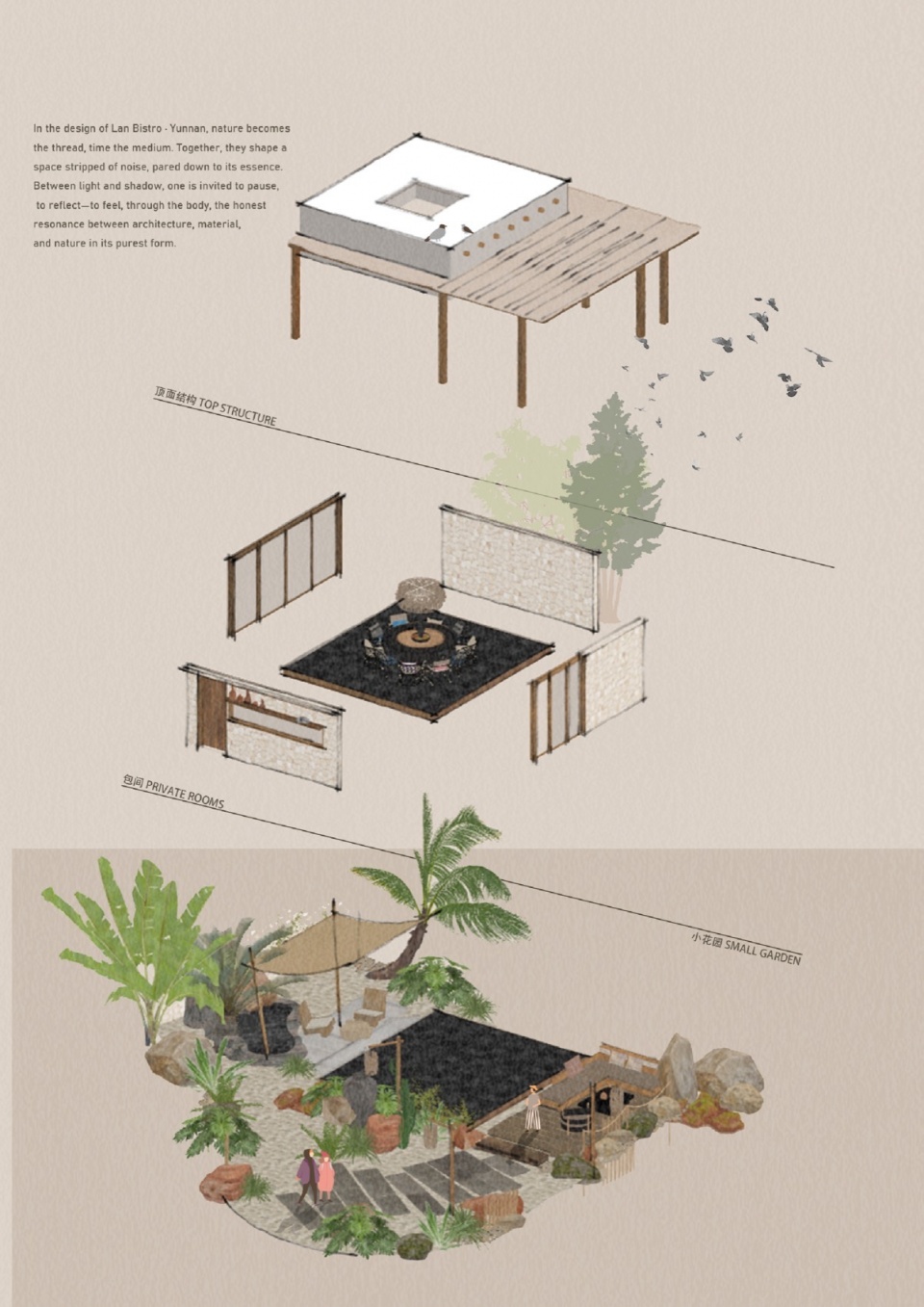 在这次Lan岚·云南bistro餐厅的设计中,我们以自然为脉络,以时间为媒介,营造出一个剥离喧嚣、回归本质的存在。在光影流转之间,让人得以暂停、沉淀,用身体感受建筑、材质和自然之间真实共振的纯粹状态。