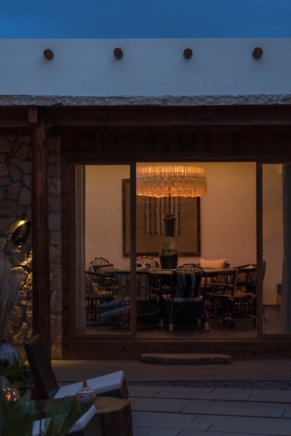 by nightfall, strings of lights sway gently in the breeze from bamboo branches, casting a warm golden glow that reflects in the still surface of the pond. Copper wall sconces line the stone façade, their soft lantern-like halos bathing the building in a warm, inviting radiance.