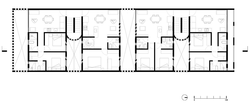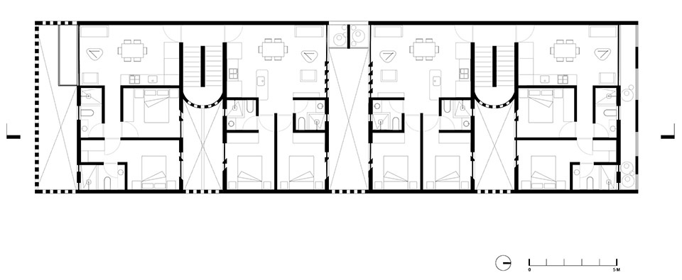 Each tower is crowned with a barrel vault, which not only provides a distinctive character to the design, but also functions as an additional space for the apartments located on the top floor. These vaults create an interesting play of curves on the roof, offering dynamism and character to the complex.