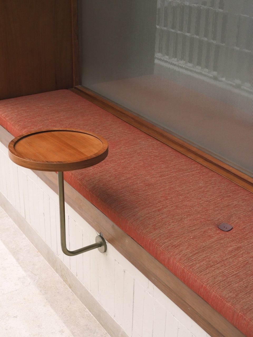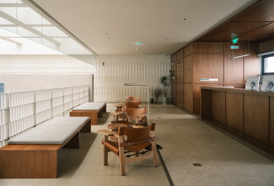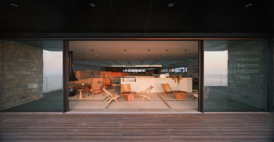 We have placed the coffee area on the eastern side of the public space. The original large fixed glass panel has been replaced with four heavy sliding doors. When opened, they blur the boundary between indoors and outdoors, allowing guests arriving on the island to face the sea directly and enjoy the warmth of the sunrise.