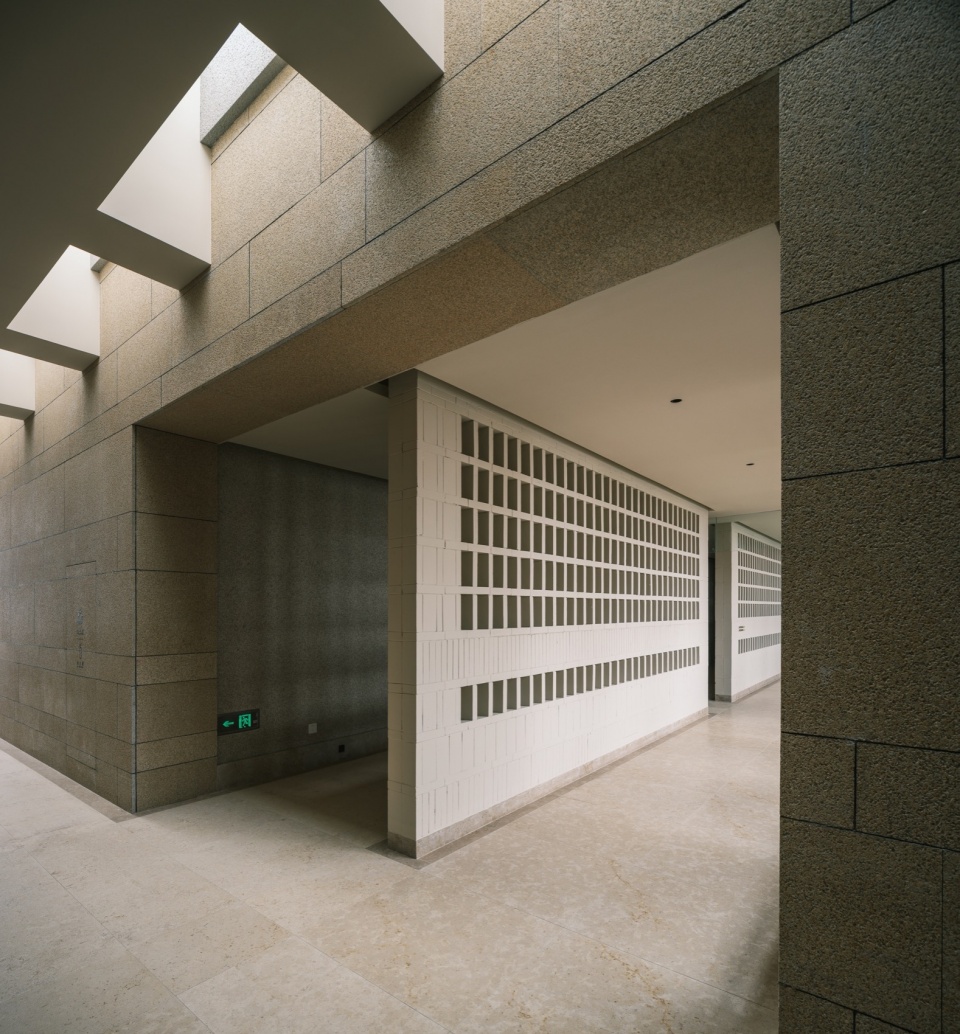 中庭的挑空区域我们通过调整不同的完成面尺寸来满足砖本身的模数,保证了砖不被切割从而整块使用,也使得视觉上有连贯性和统一性。客房的走廊墙面则采用了浅咖色真石漆,与吊顶的乳胶漆形成反差及对比。