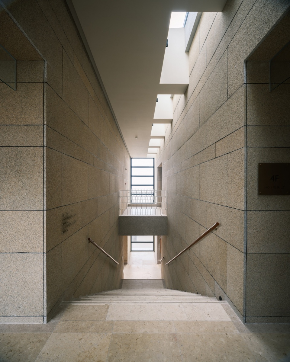 The public area floors are covered with beige natural marble, distinguishing different areas using the same color with different finishes.