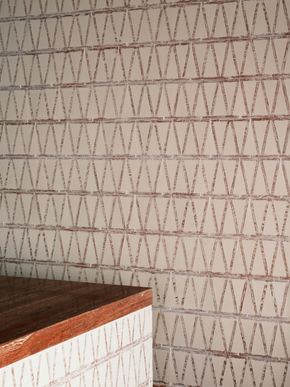 我们以岛上原有的石屋石墙为灵感,空间和材质里的隐喻都围绕着“石”来展开。通过耐火砖的拼贴与组合,作为整体大堂的装饰语言,当客人沿途经过一栋栋石屋之后进入酒店大堂时,砖的机理能延续石屋墙面,同时采用米色的肌理漆涂刷与砖块表面,与原本的石墙形成反差,也凸显出中庭裸露的礁石。砖铺贴时凹凸的进退关系使得原本由平面构成的图案被转化为立体形式,产生了光影。而耐火砖本身统一规格的尺寸极大地方便了运输及施工铺贴。