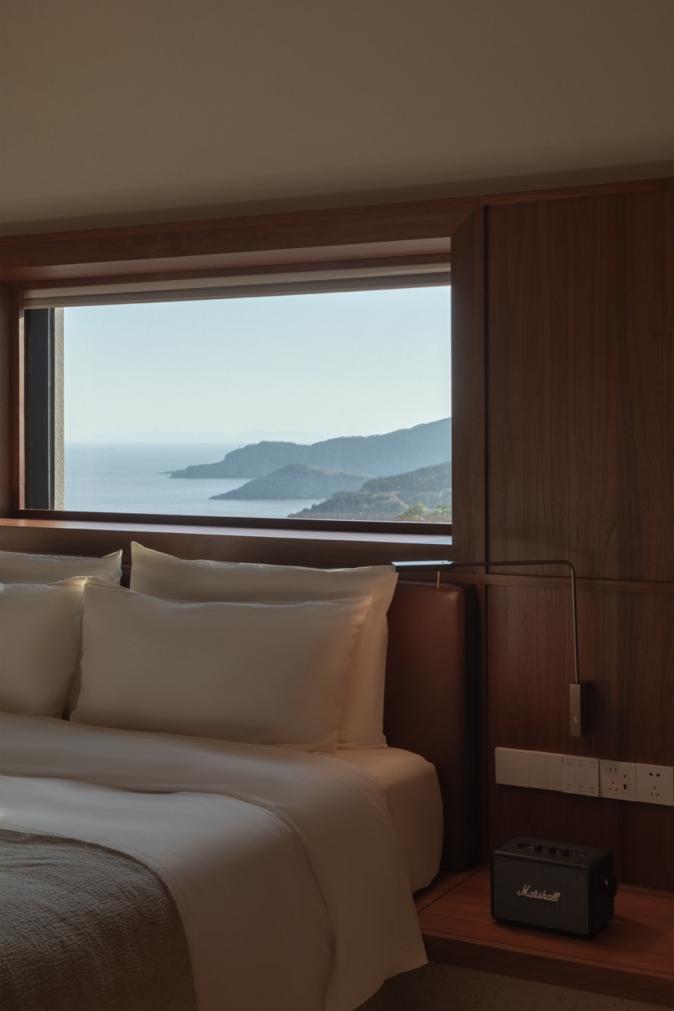 其余部分客房则选用柚木木饰面及300*300*18mm统一规格的米色大理石来装饰房间。我们将原本密闭在室内卫生间的泡池区域改成了半室外泡池,将建筑门窗内退至淋浴区,使客人在进入泡池时可以直面大海,面拂海风。