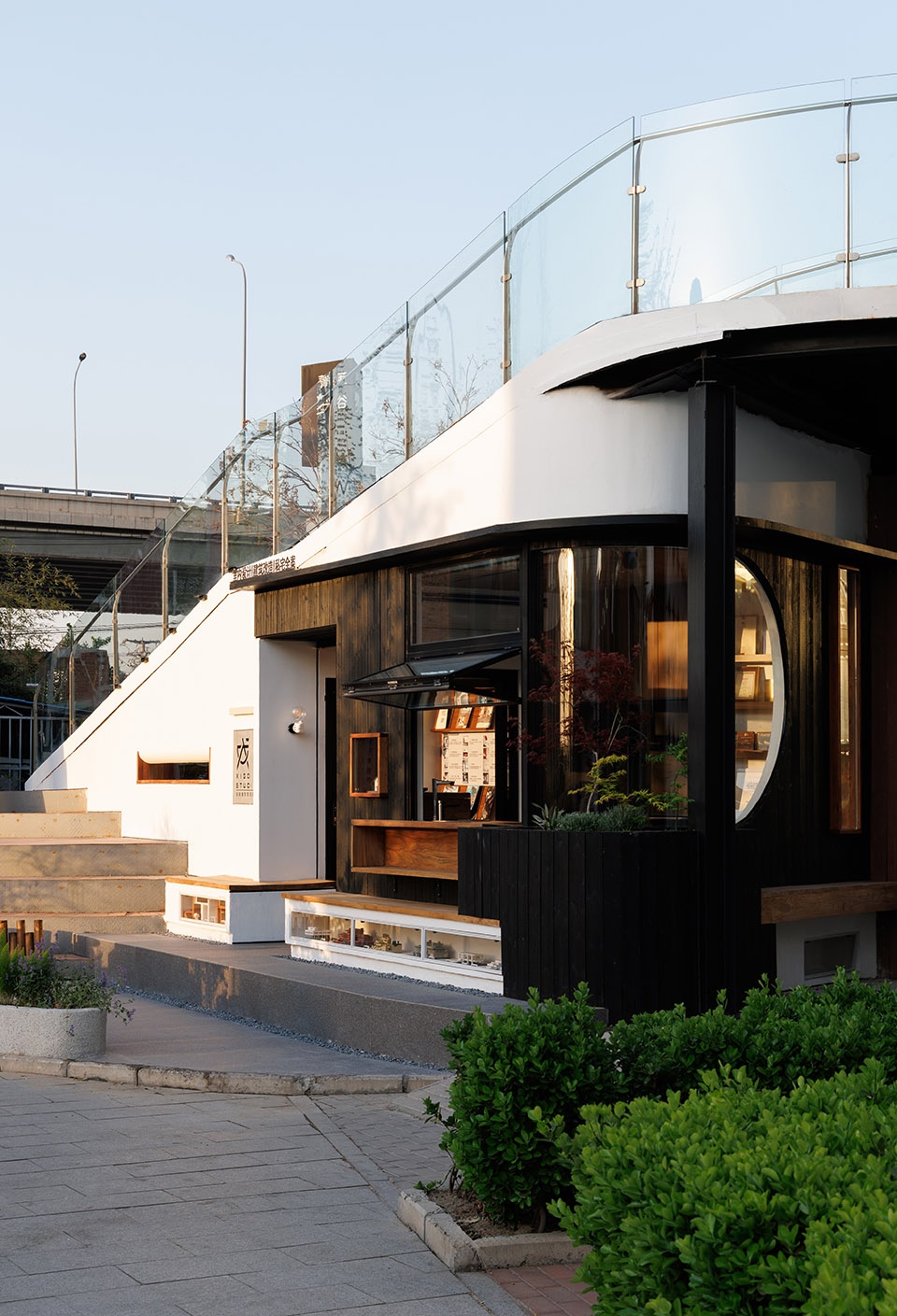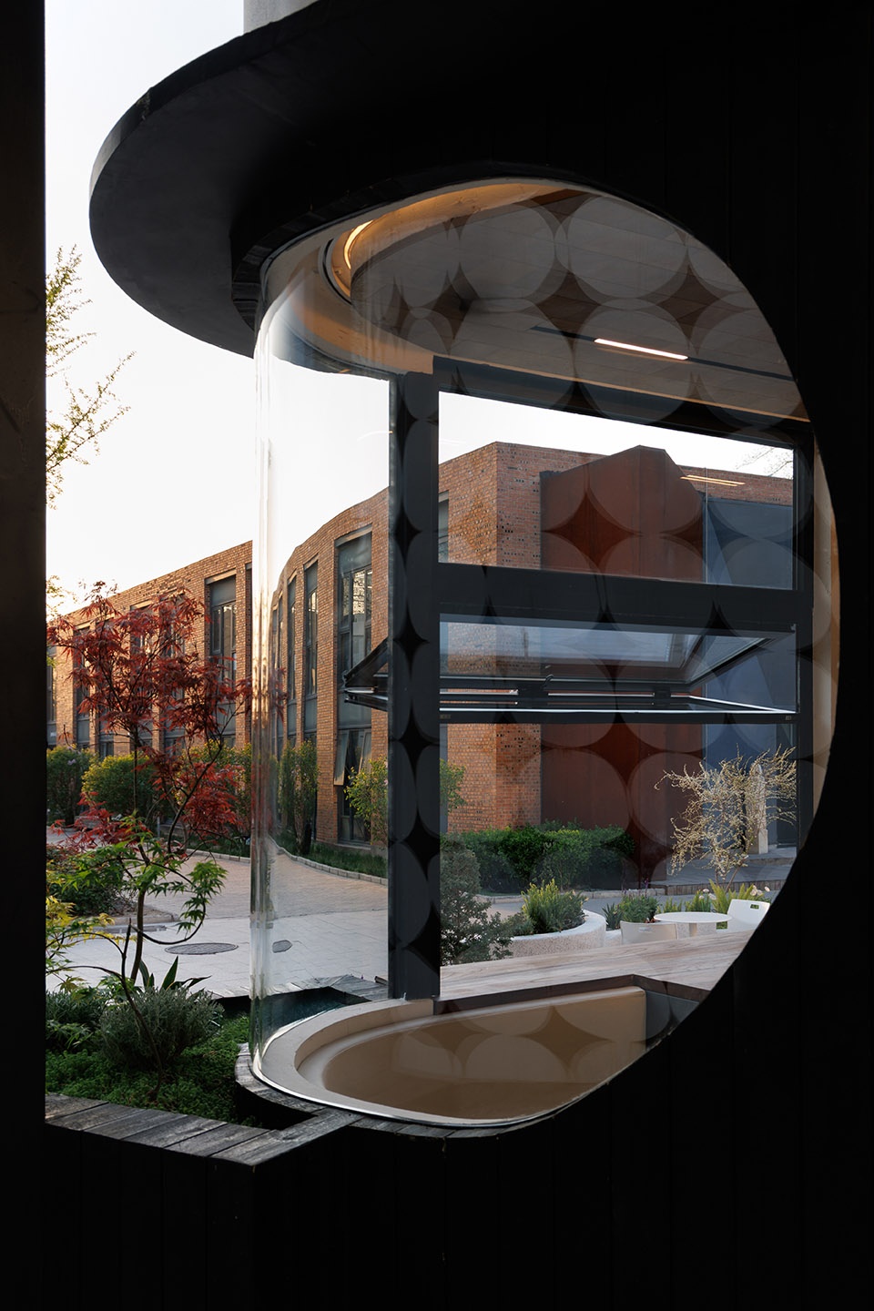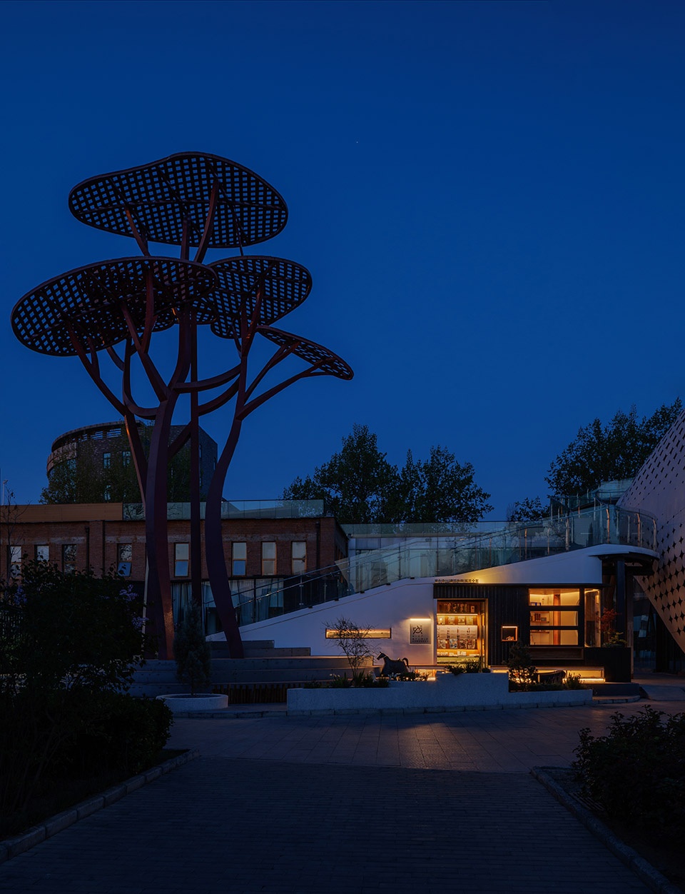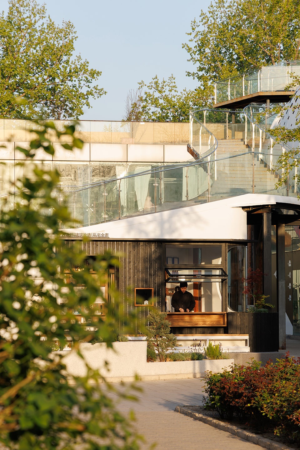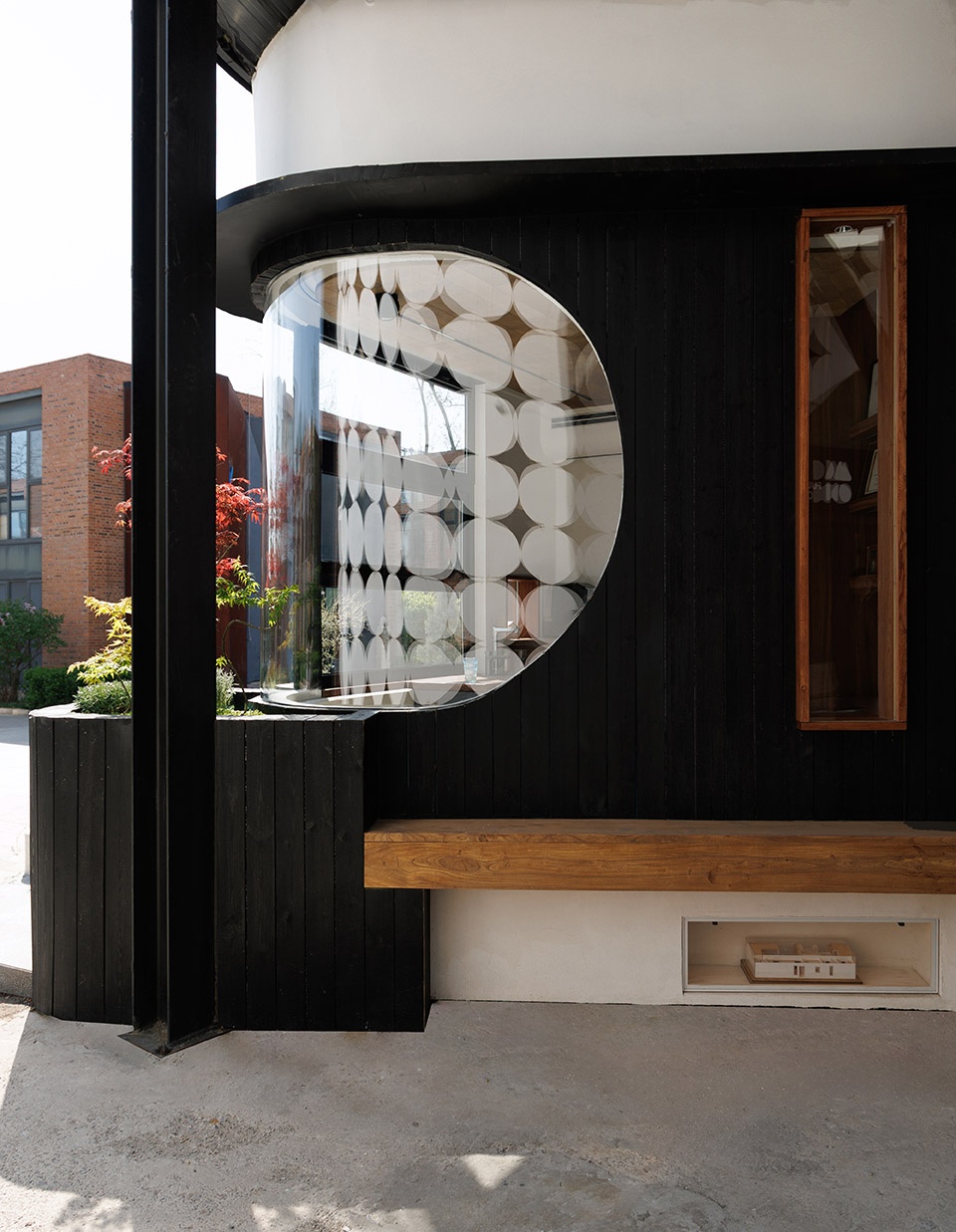 The entrance is positioned at the juncture of the black and white areas, featuring a concave-shaped opening that enhances the facade’s three-dimensionality and creates a display zone, arousing people’s curiosity to peek inside. The concave form inherently implies an inward extension, metaphorically “absorbing the energy of heaven and earth,” which blurs the boundary between indoor and outdoor spaces.