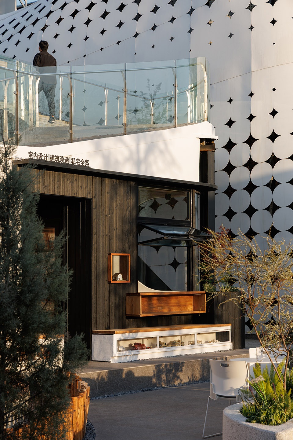 The facade uses old elm planks to connect different areas and angles, such as black and white zones, front and side surfaces, creating a strong sense of continuity and integrity. To enrich the interface and enhance indoor lighting, various openings are designed, including long windows, vertical windows, and square windows. These are framed with elm wood to serve as display windows for exhibition purposes.Elm wood is also applied to the bar countertop. When the store’s lift window is opened, the wooden material connects the interior and exterior spaces, while the area under the countertop is added as an exhibition zone, infusing the interface with vitality.