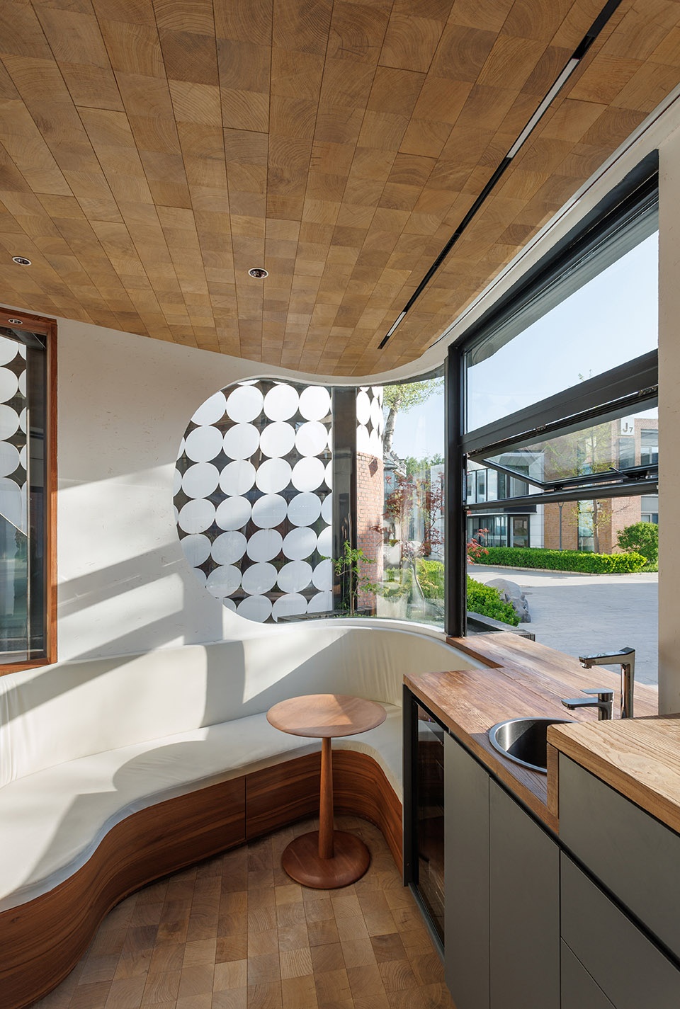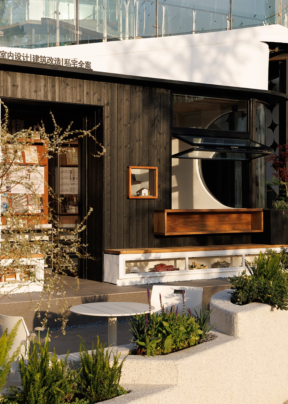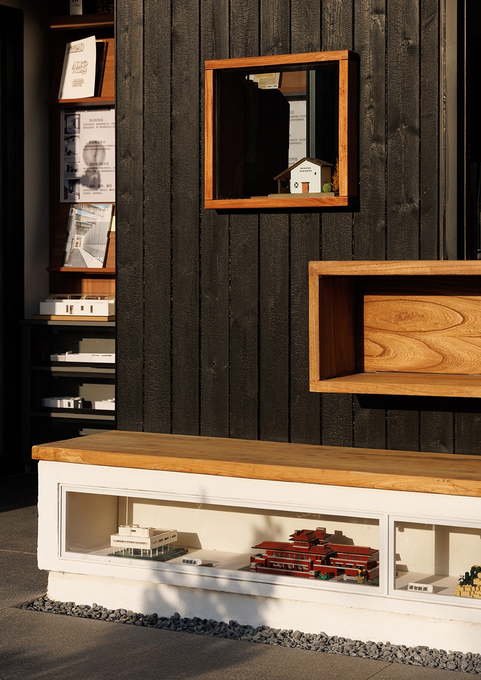 小木屋的立面下部特意设置了较为低矮的橱窗展陈,在延伸出来的座椅内部。其高度设的定目正是为了让人们蹲下观看和驻足,并且设置了不同高度的座椅尺度,正面为座,侧面为靠。不同高度的榆木坐台又与花池之间形成三种不同的积木搭接关系,立面丰富多变。