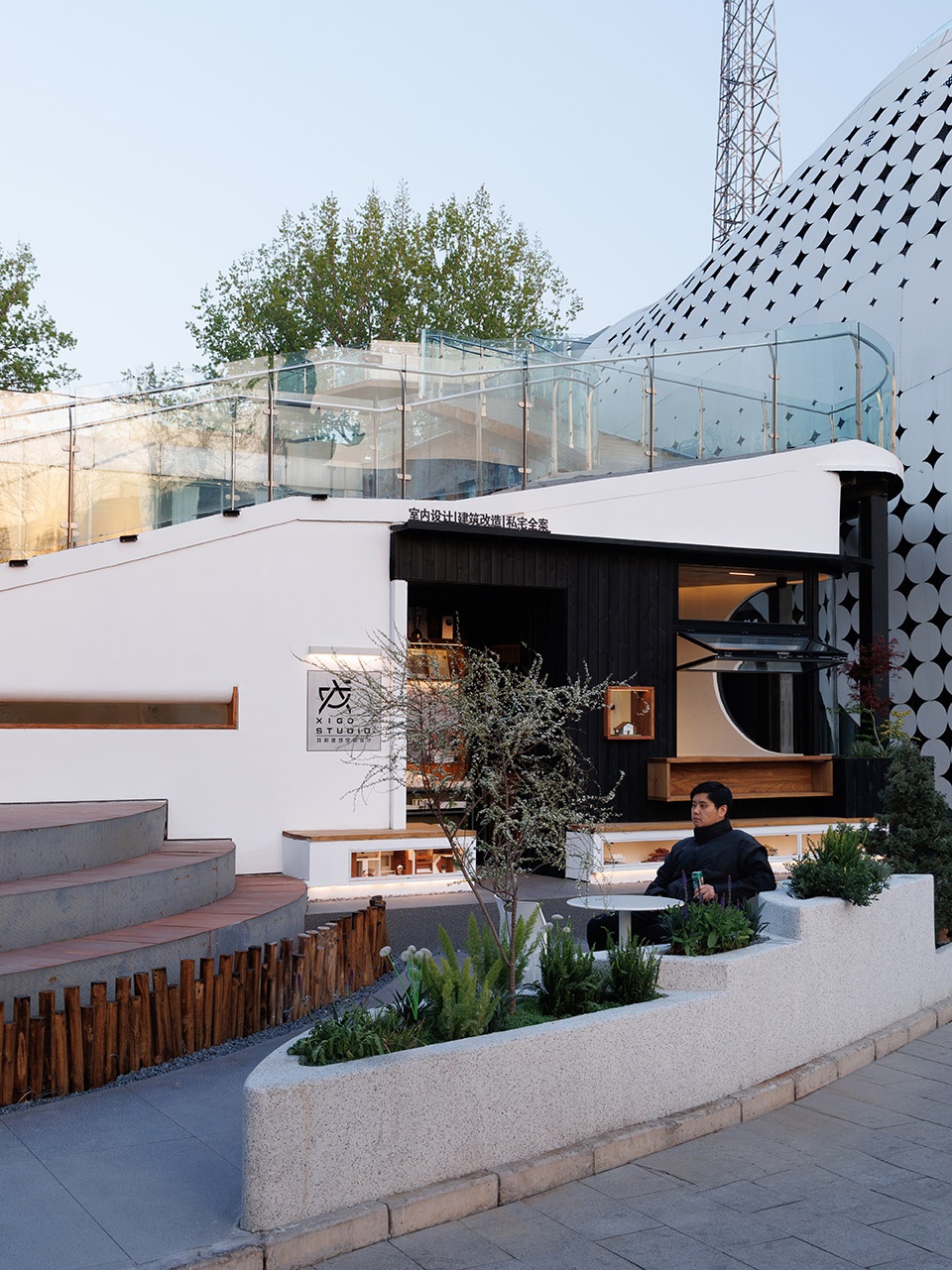 “XIGO STUDIO®” Architectural & Space Design Firm is located in the Elite Dream Valley Industrial Park on Guangqu Road, Chaoyang District, Beijing. The chosen site—a public stairwell within the park—was formerly a property warehouse and later repurposed as a milk tea shop prior to our acquisition. Characterized by a narrow, elongated layout with north-facing illumination, the space sits at the entrance of the entire park, boasting an expansive facade and outdoor seating area, while its interior spans a modest 20 square meters. Adjacent to a massive white heteromorphic structure, the site’s distinctive environmental qualities captivated us, prompting the decision to transform it into a one-of-a-kind studio.