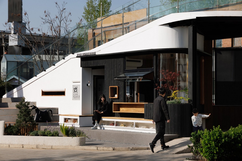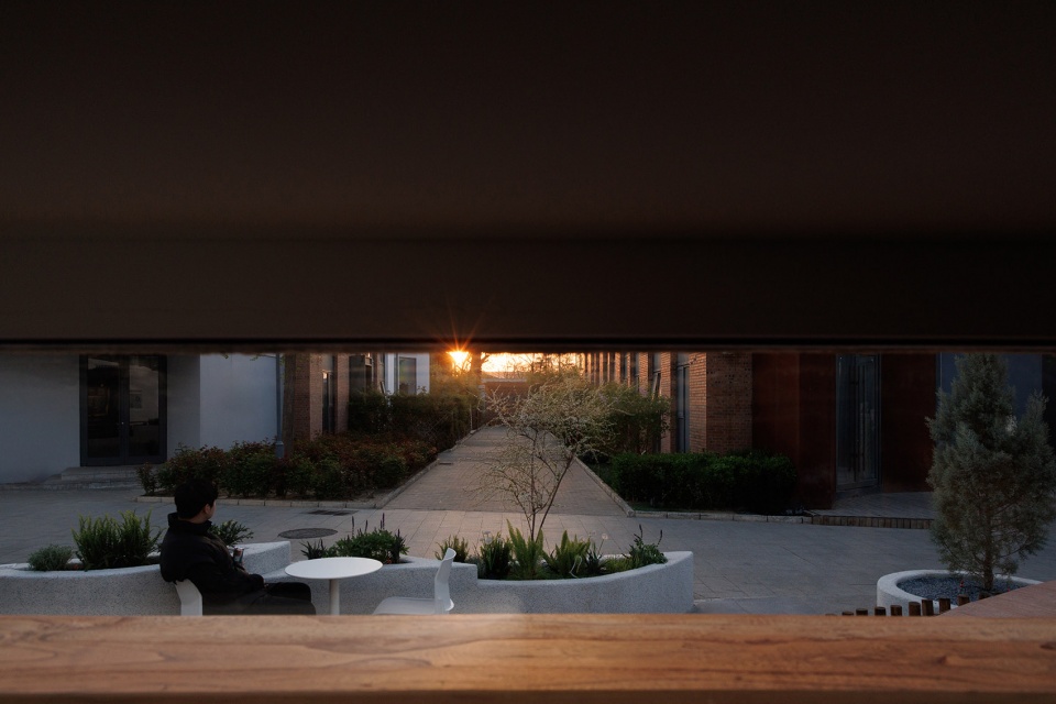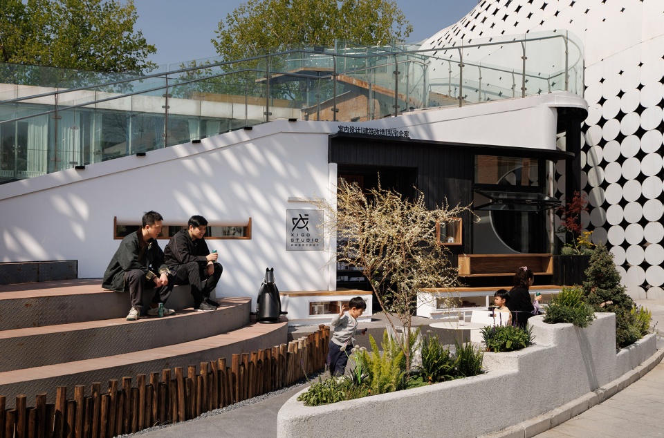 向外延伸的外摆区可以为园区人员提供日常聊天休憩的公共场所,并将花池也视作为展陈的一部分。天气好的时候洽谈便可移步至户外,让花花草草环绕其中。也可适时举办展览市集等活动,将室外部分充分利用。