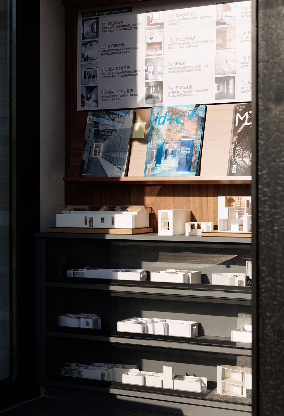 右侧的另一卷展示了收藏的乐高大师建筑系列模型,以乐高小人作为场景展示。入口的展示墙,以结合杂志、奖杯、展板和工作模型作为日常陈列,结合工作内容实时更新。