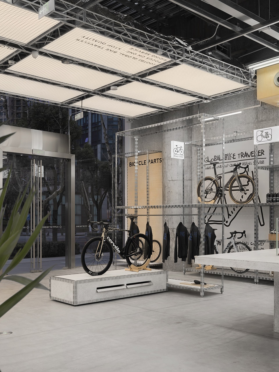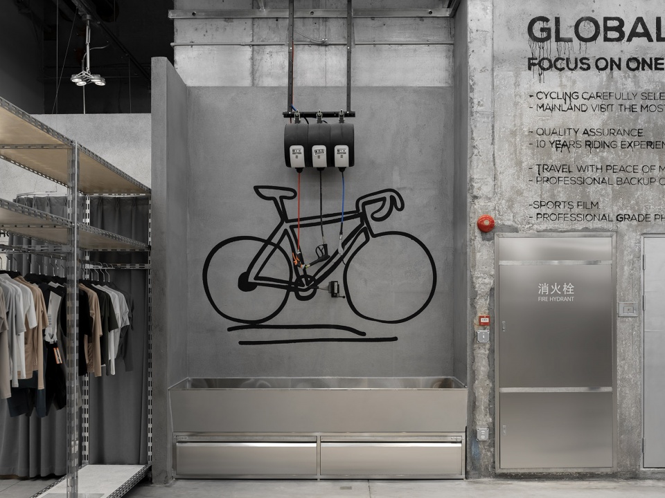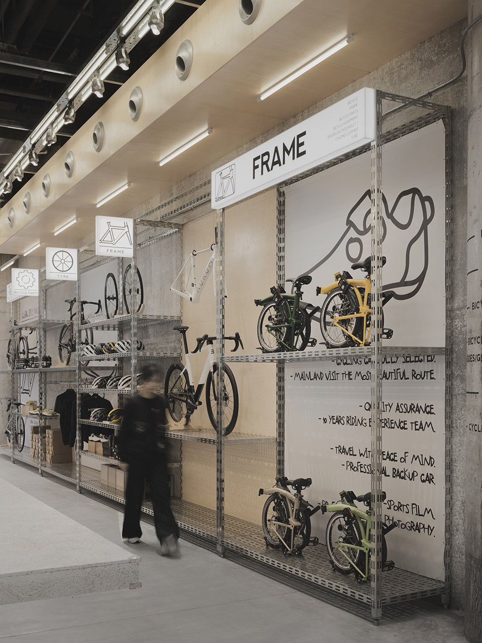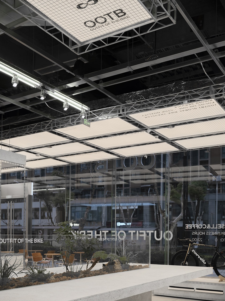 它不只是一间店铺,而是骑行精神的浓缩舞台。粗粝的工业考古质感与灵动的数字脉搏在此刻共生;模块化的骨架承载着商品、工坊、聚会的万千可能;透明开放的空间剧场,让冰冷的器械有了温度,让精密的工艺直抵人心。从砖墙的肌理,到升降的货架,再到地面的光迹、耳畔的胎噪……每一处设计都在低吟:骑行不止于脚下,它早已融入空间骨血。踏入OOTB,你并非过客,而是骑士归港,引擎暂歇后,精神仍在自由延伸——直至下一个黎明,下一段未知的轨迹。这便是骑行赋予生活的高光,也是OOTB为这份自由筑造的精神巢穴。