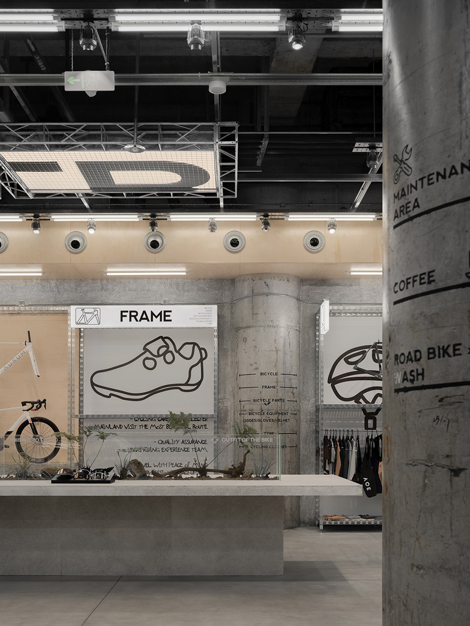 OOTB诞生于中国都市骑行文化复兴浪潮,以“骑行装备零售”为商业载体,融合个性化定制服务、文化传播与社群社交三重基因,选址武汉天地与成都铁像寺水街,直面年轻中产及专业骑行群体。设计突破传统零售空间的交易逻辑,通过场景化叙事构建骑行文化深度体验场域,回应三大核心诉求: