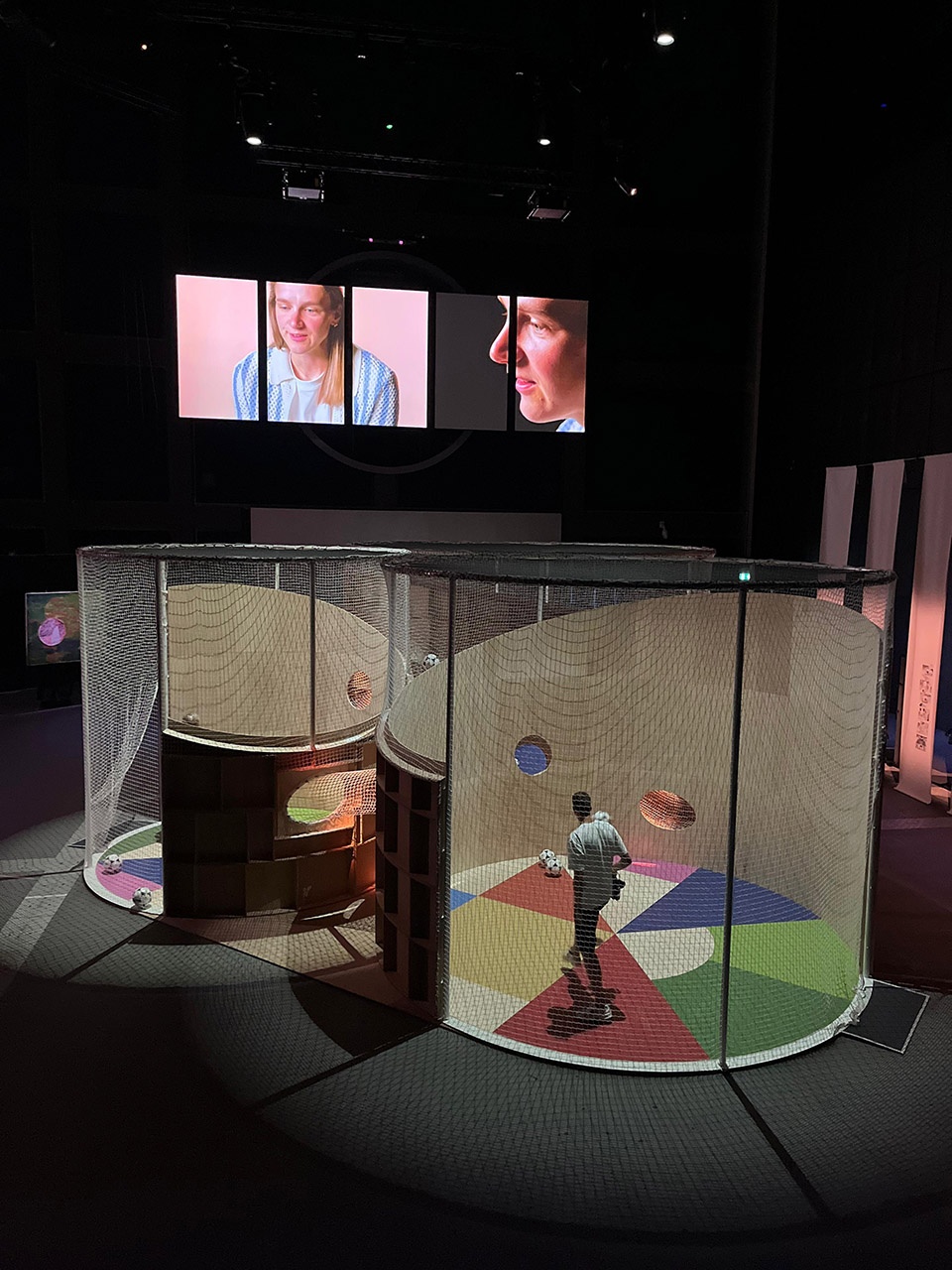 该作品展出至8月24日,位于曼彻斯特的Aviva Studios(Factory International),这是一个专注于创造力与大型沉浸式体验的文化场所。装置从场地的工业气质中汲取灵感,在美学风格上与之呼应,打造出一个强烈而富有象征性的足球环境。其结构采用了模块化墙体系统,由胶合木型材与多层面板垂直构成。墙上的圆形开口系统则是参考专业足球运动员建议所设计而成的。