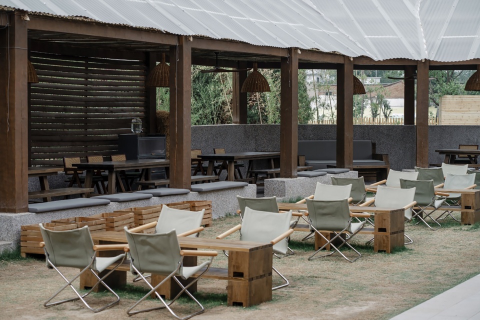 场地原本的梁、柱,由回收的老木板所覆盖,整体构建出线条的秩序感,老木板的颜色、肌理,经过时间沉淀,令人与农场木屋产生天然地联想,铺垫出田园叙事的基调。