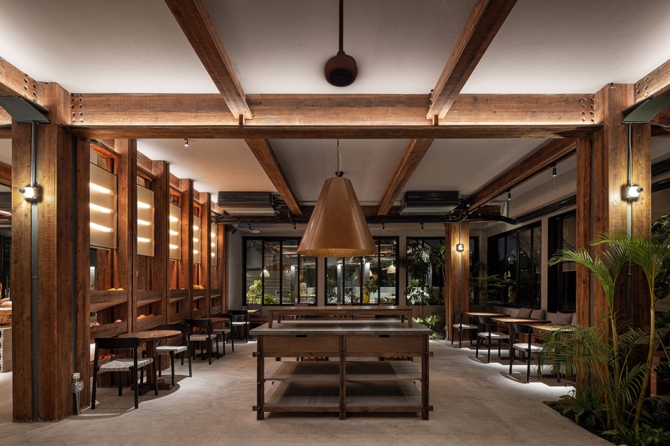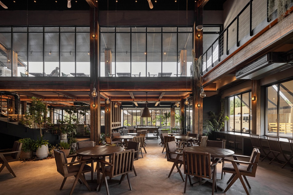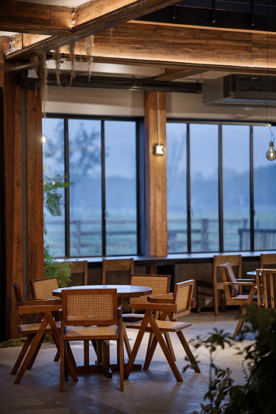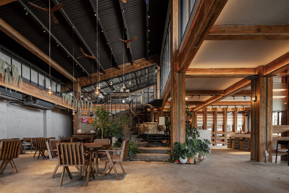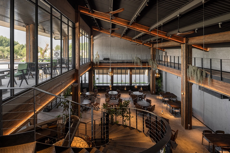 The original beams and columns are clad inreclaimed timber planks, establishing a unified rhythm of linear forms. The wood’stime-worn patina and grainevoke an instinctive association with farmhouse structures, anchoring the spatial narrative