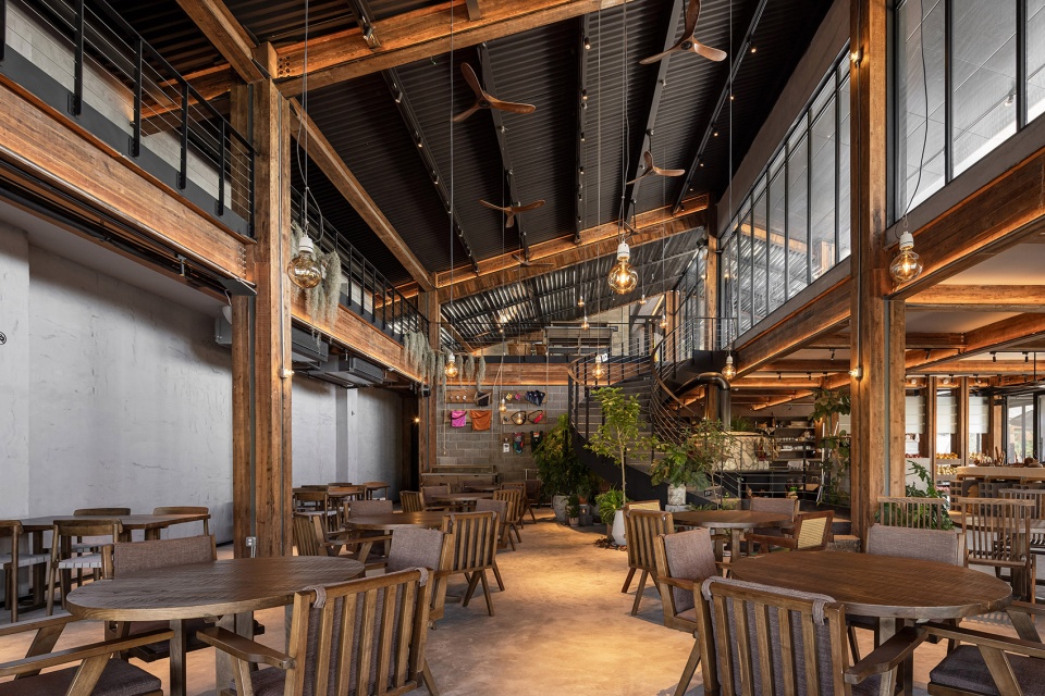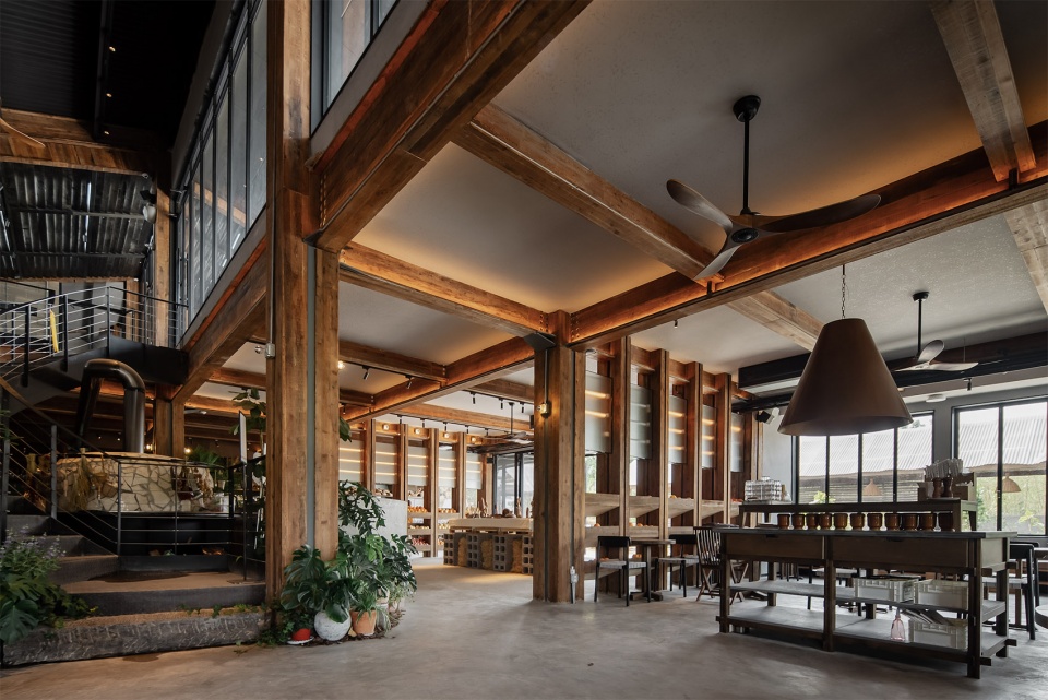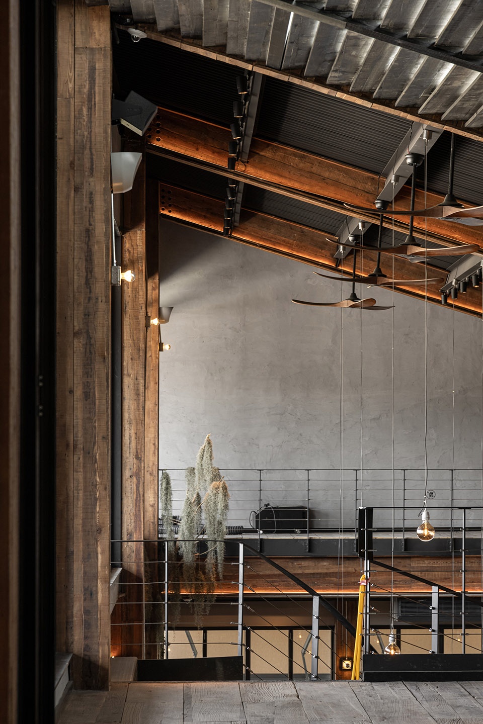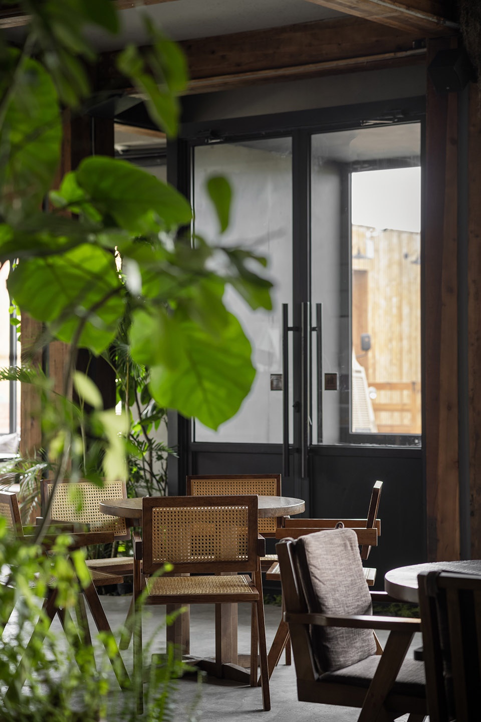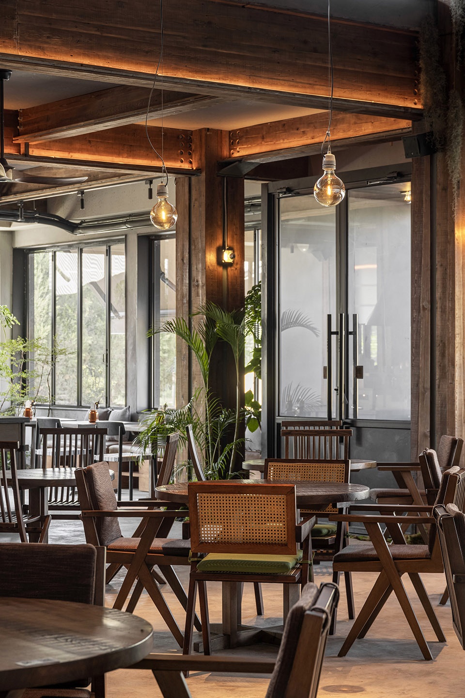 The original beams and columns are clad inreclaimed timber planks, establishing a unified rhythm of linear forms. The wood’stime-worn patina and grainevoke an instinctive association with farmhouse structures, anchoring the spatial narrative