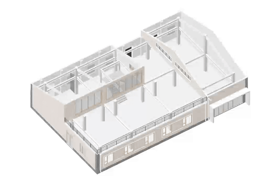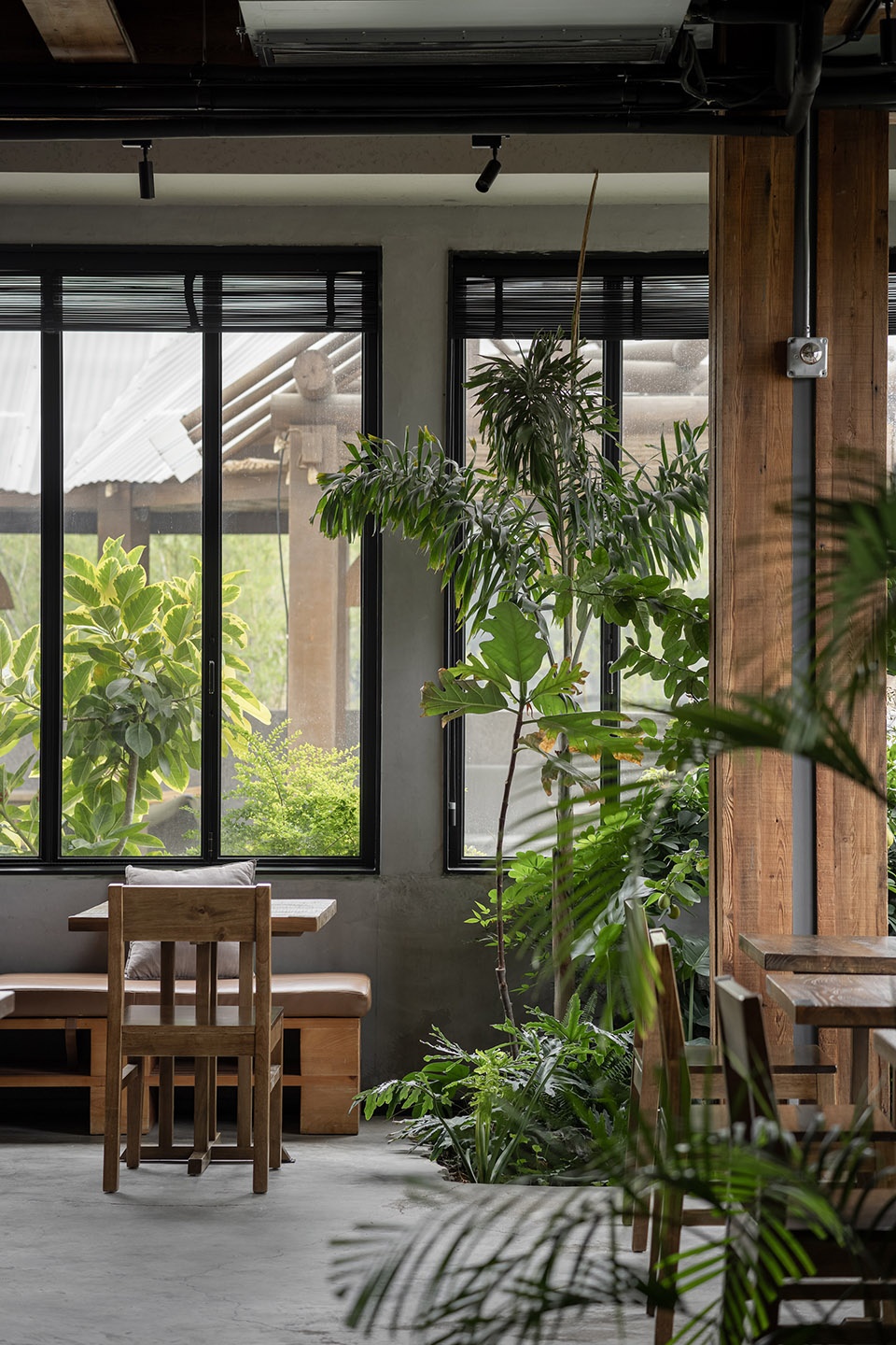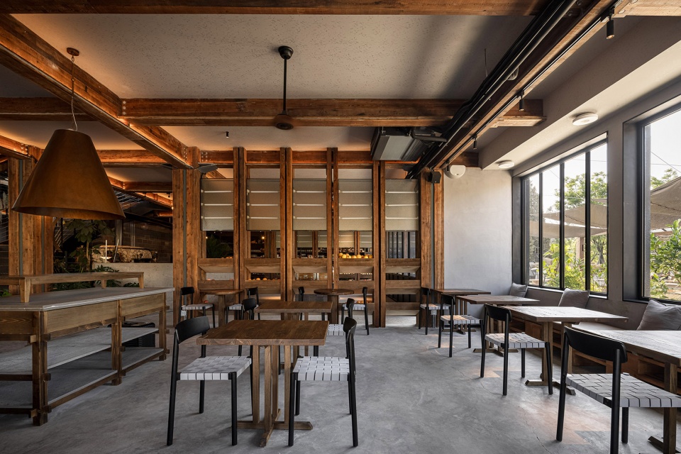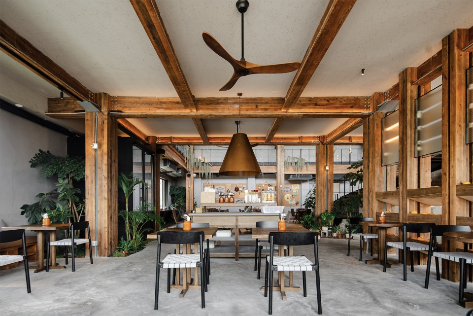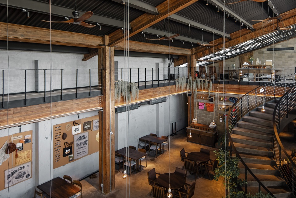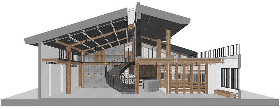 The original beams and columns are clad inreclaimed timber planks, establishing a unified rhythm of linear forms. The wood’stime-worn patina and grainevoke an instinctive association with farmhouse structures, anchoring the spatial narrative