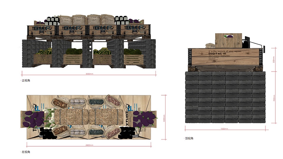 ▼空心砖展台和两侧的果木箱,Hollow block stand and fruitwood boxes on both sides