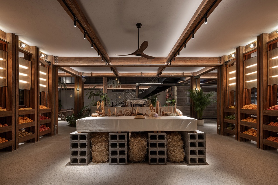在设计之初,考虑到米禾农场具备种植条件,我们提出“去餐厅化”的概念,即摒弃单一场景,打造“从农场到餐桌”的可游、可感、可食等多元体验。在传统就餐区和后厨区的布局规划基础上,增加了食材展示区、面包工坊和明档披萨炉。