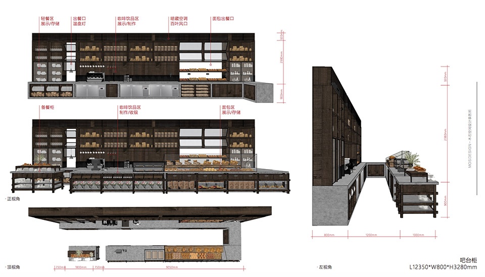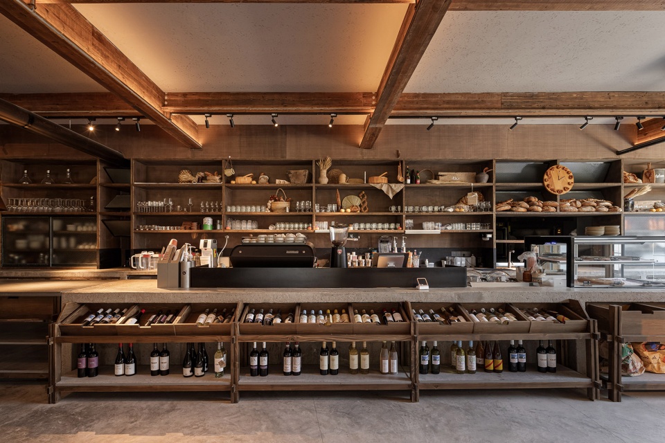 面包工坊位于一层的东南角,即入口右侧,引导顾客自然关注,避免与餐厅经营产生动线重叠,面包工坊提供当日新鲜面包外带,通过建筑南侧立面的玻璃实现对外展示。
