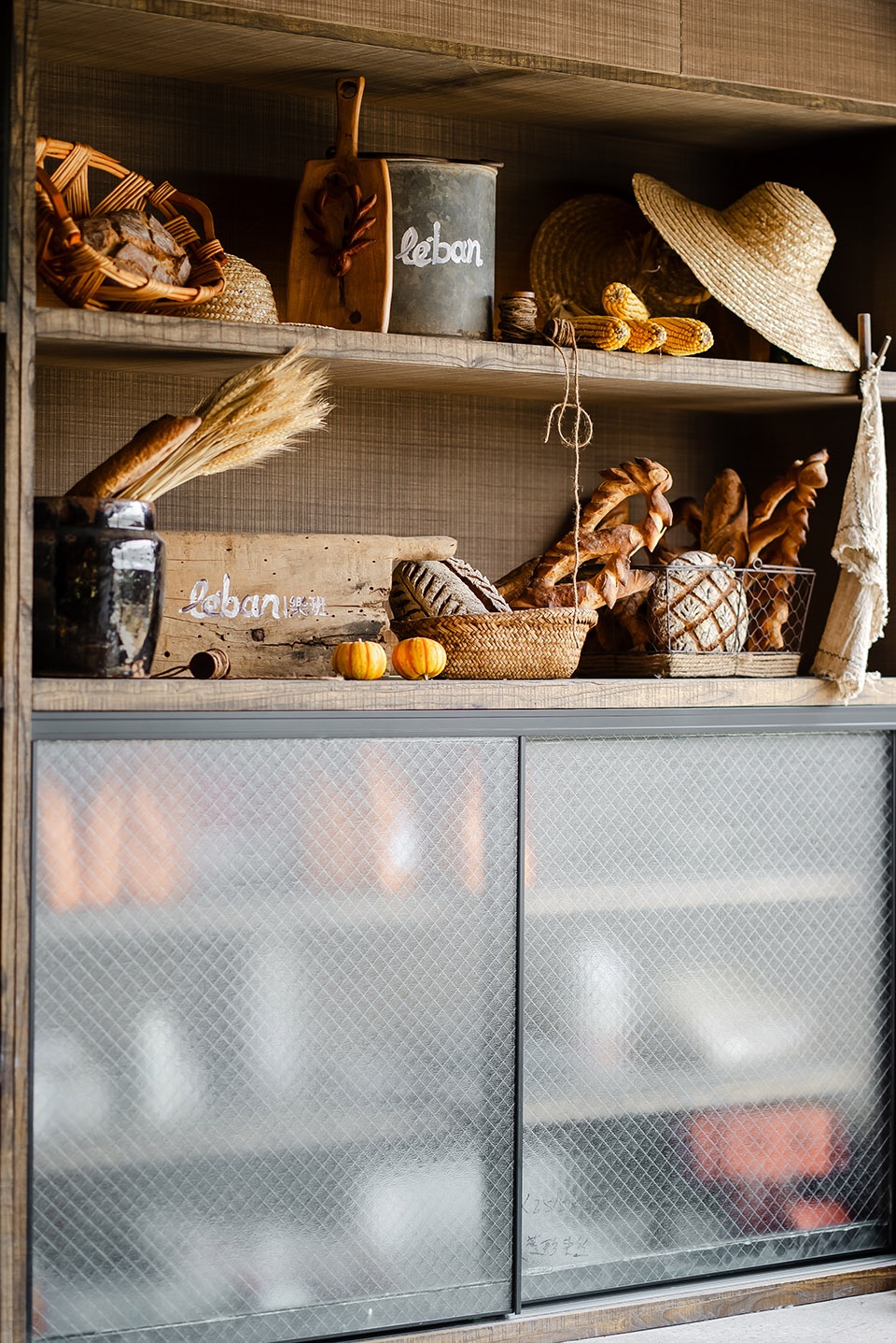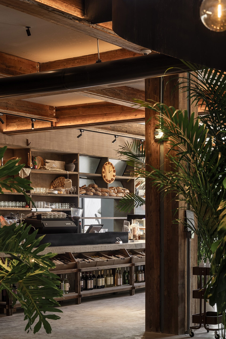 同时,黑色钢板材质的门窗、楼梯扶手、护栏,呈现出锻造的工业技艺,空间部分墙面装有软木板,并将带有品牌元素的创意布艺、植物叶片、草帽等元素固定其上,与空间摆放的新鲜面包、食材、舒展的植物,共同营造出农场生活“自给自足”的手作温度。这样一来,多元材质与天然物料的相互碰撞,展现了农场餐厅的丰富性与趣味性,可持续设计的理念也得到诠释。