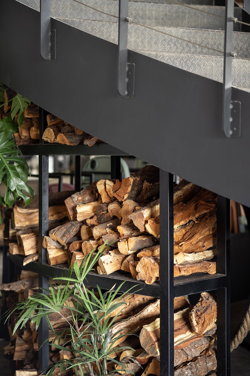 在一层中央区域,我们设置穹顶式明火披萨炉,以水泥砌筑的弧形操作台包裹,与相邻的旋转楼梯形成空间焦点,顾客沿楼梯上下穿行可360度观察披萨制作过程,强化”农场厨房”的仪式感,明火这种最原始的烹饪方式也会让果木和发酵小麦香气四溢,放大食物本真自然的味道。