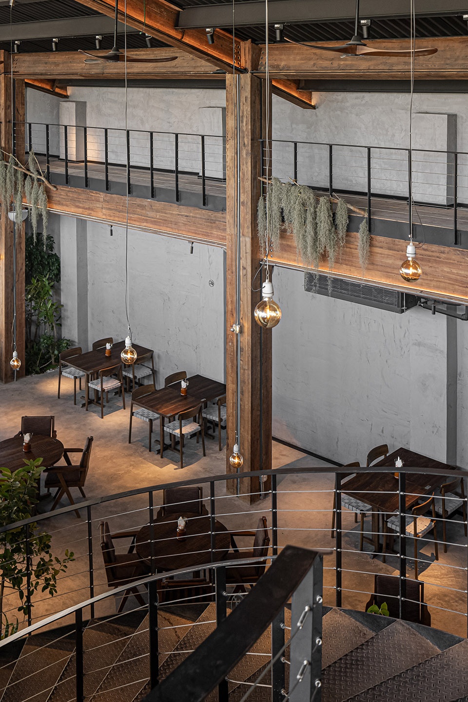 设计保留了原始场地的挑空区,顶部悬挂草木藤艺装置,通过钢结构楼梯衔接一、二层,保证视觉通透性并形成自然气流循环,动线由搭建层区域游走到挑空区,也产生空间尺度感的变化,有着更加开阔的空间感受。