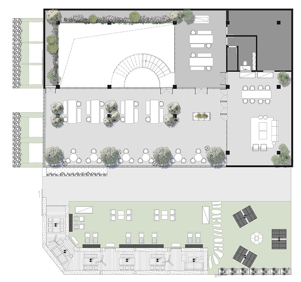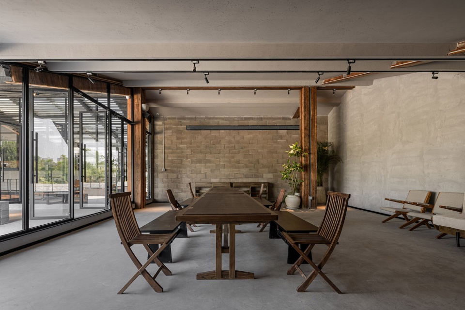 The second-floor terrace is situated on the south side of the building. Sheltered beneath an overhanging eave, it features an outdoor dining area offering panoramic views of the farm. Additionally, asloped glass roofhas been constructed over the terrace to expand the interior usable space. Near the eastern end of the second floor, a private dining room extends the restaurant’s design language, furnished with a communal table accommodating large groups or events.