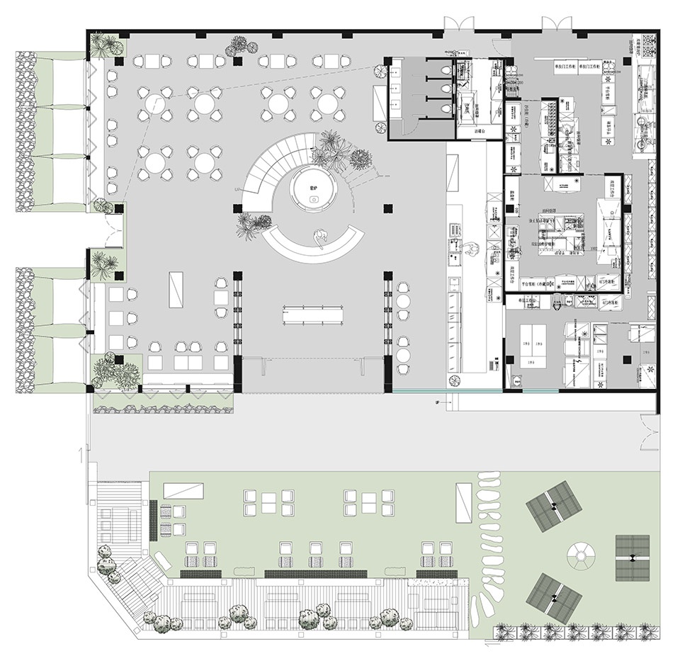 对樂班农场餐厅的设计实践,始于我们对农场型经济当代转型的持续思考,而更具启发意义的是,从餐厅投入经营的数据来看,证明了“农场叙事“的设计策略在餐饮空间中的商业潜力。由此,在后续与品牌的深度合作中,我们挖掘并提炼农场餐厅中有参考价值的部分,结合不同场地特质和商业定位,希望赋予品牌持续不断的商业活力。