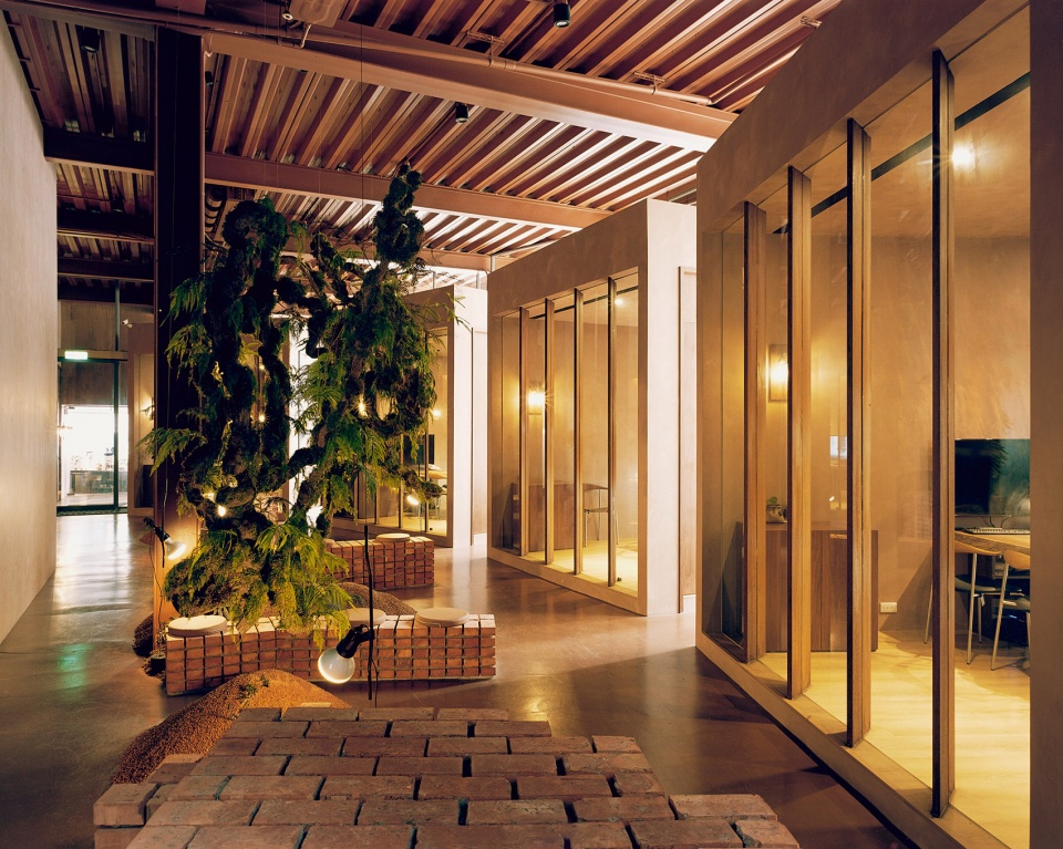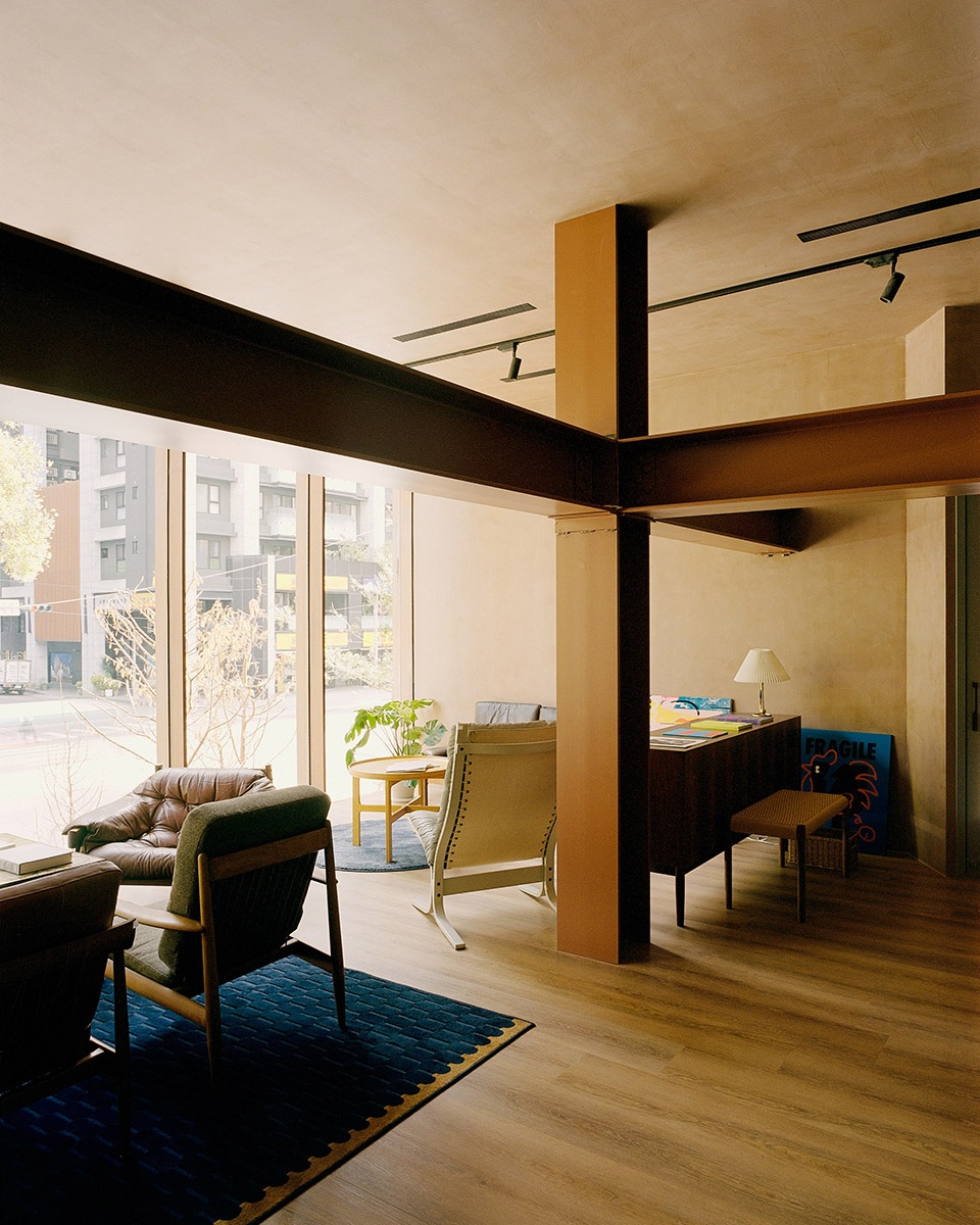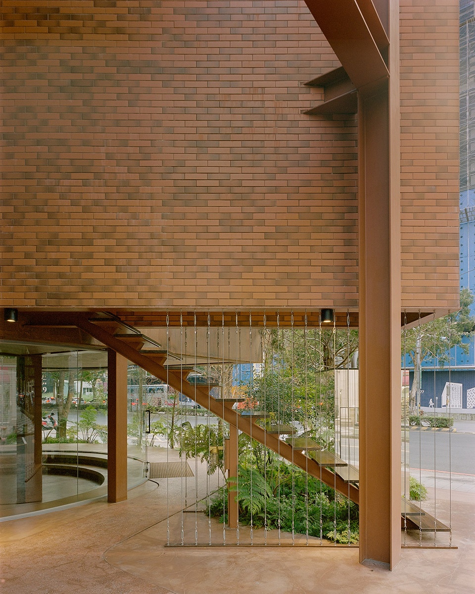 在这座开发商总部大楼中,工厂钢结构构成了空间布局的基本轮廓,呼应其最初作为砖窑起家的创立背景。空间被解构并依序嵌入。区别于传统商业空间的设定,设计强调“向社区开放”,将品牌愿景向公众敞开,融合再诠释的工厂美学与台湾森林印象于城市之中。