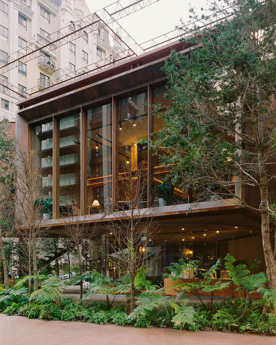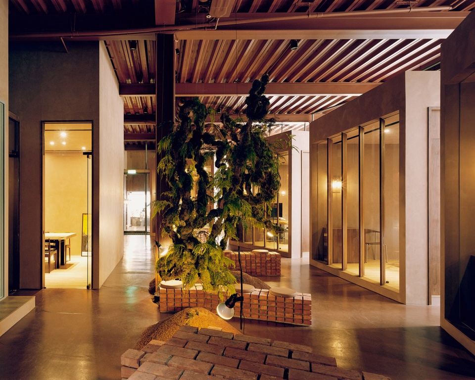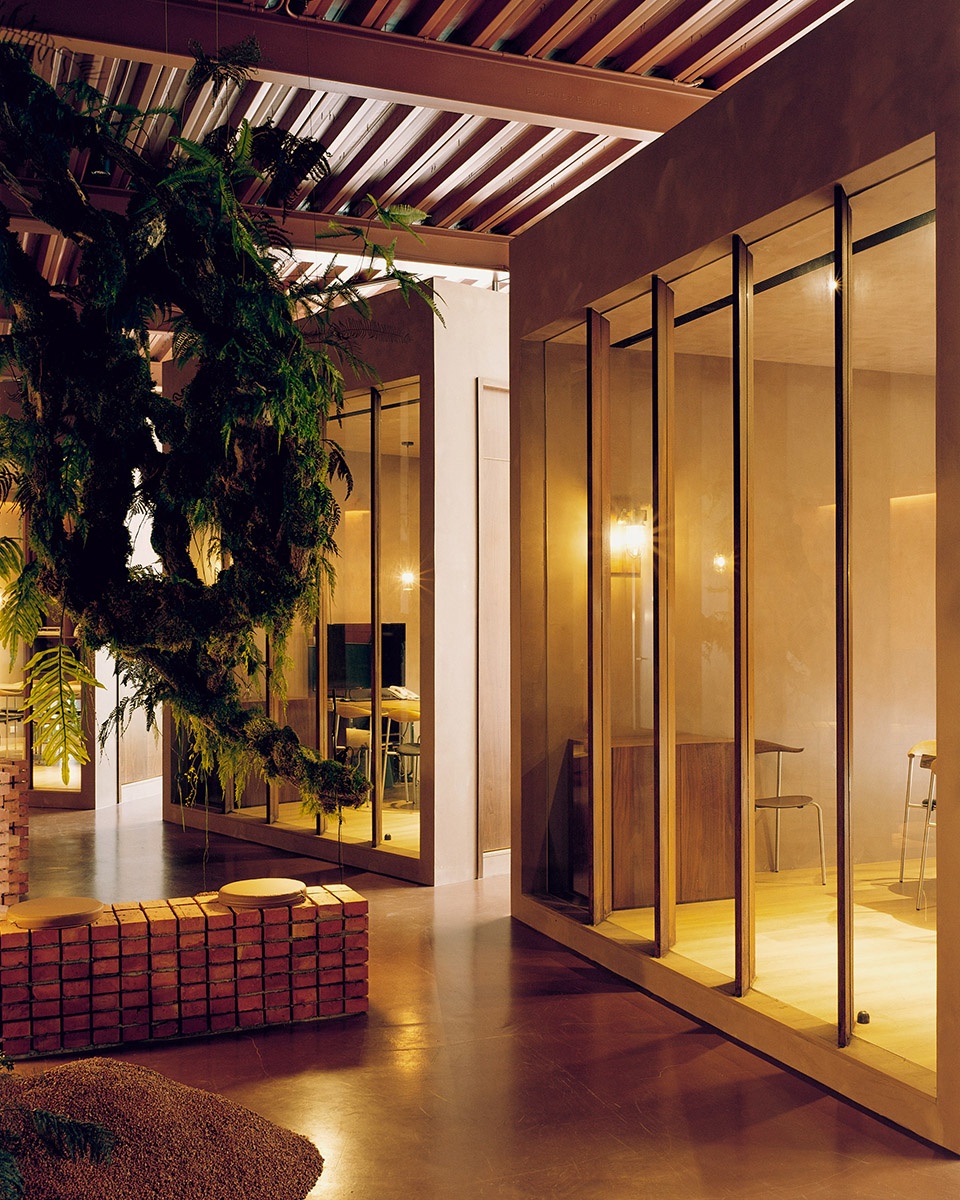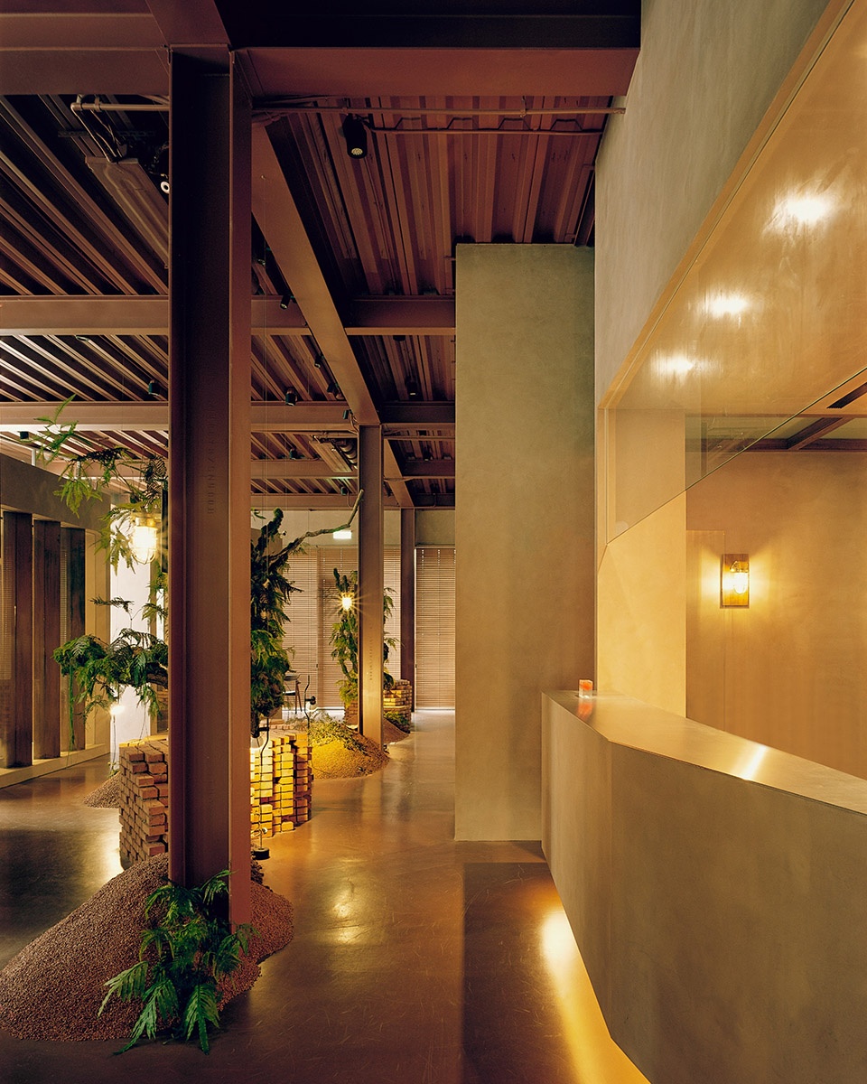 在这座开发商总部大楼中,工厂钢结构构成了空间布局的基本轮廓,呼应其最初作为砖窑起家的创立背景。空间被解构并依序嵌入。区别于传统商业空间的设定,设计强调“向社区开放”,将品牌愿景向公众敞开,融合再诠释的工厂美学与台湾森林印象于城市之中。