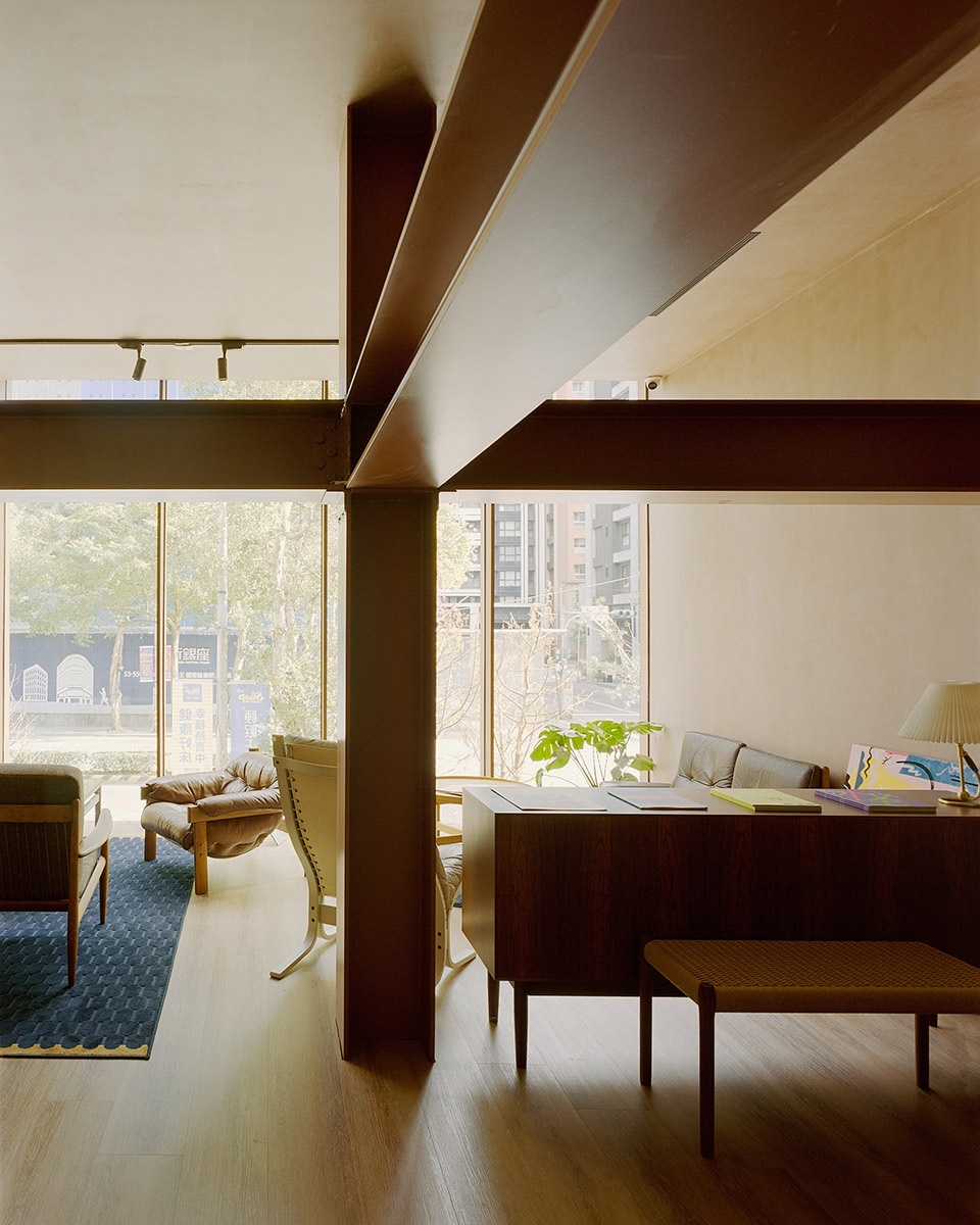 At this developer’s headquarters, the factory steel frame outlines the layout, echoing with its founding origin of a brick kiln. Spaces are deconstructed and sequentially inserted. Diverting from the commercial setting, the design emphasizes “openness to the community” and shares its brand vision with the public, weaving a reinterpreted factory aesthetic and Taiwan forest impression into the city.
