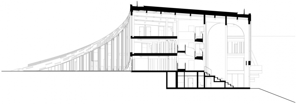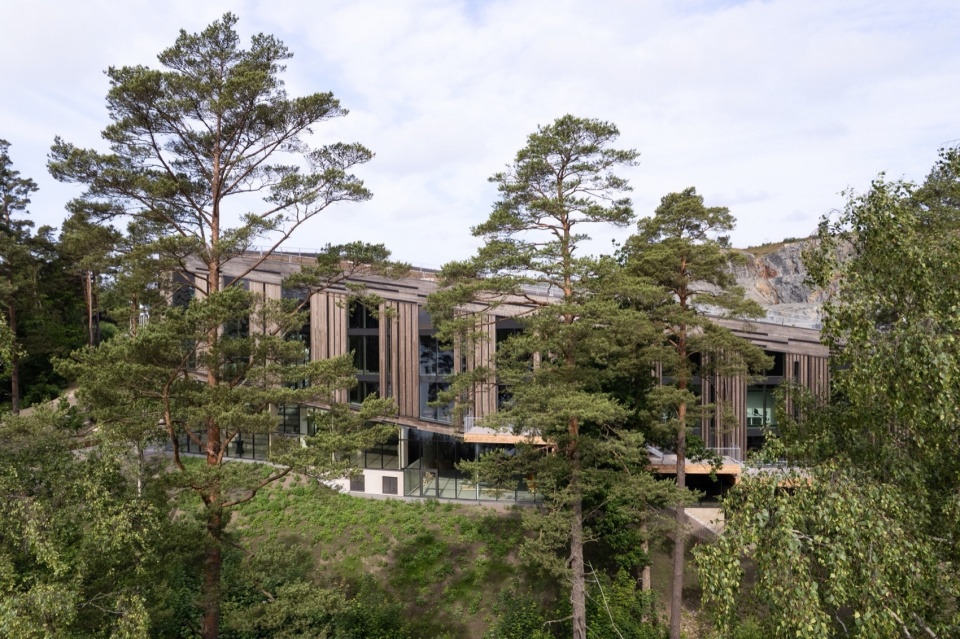 延展的建筑结构如同一条脊梁在景观中升起,创造了现有与新建筑、室内与室外、私密与共享空间之间的无缝过渡。该地区曾是采石场,其自然地形结构启发了建筑的形式和材料选择。