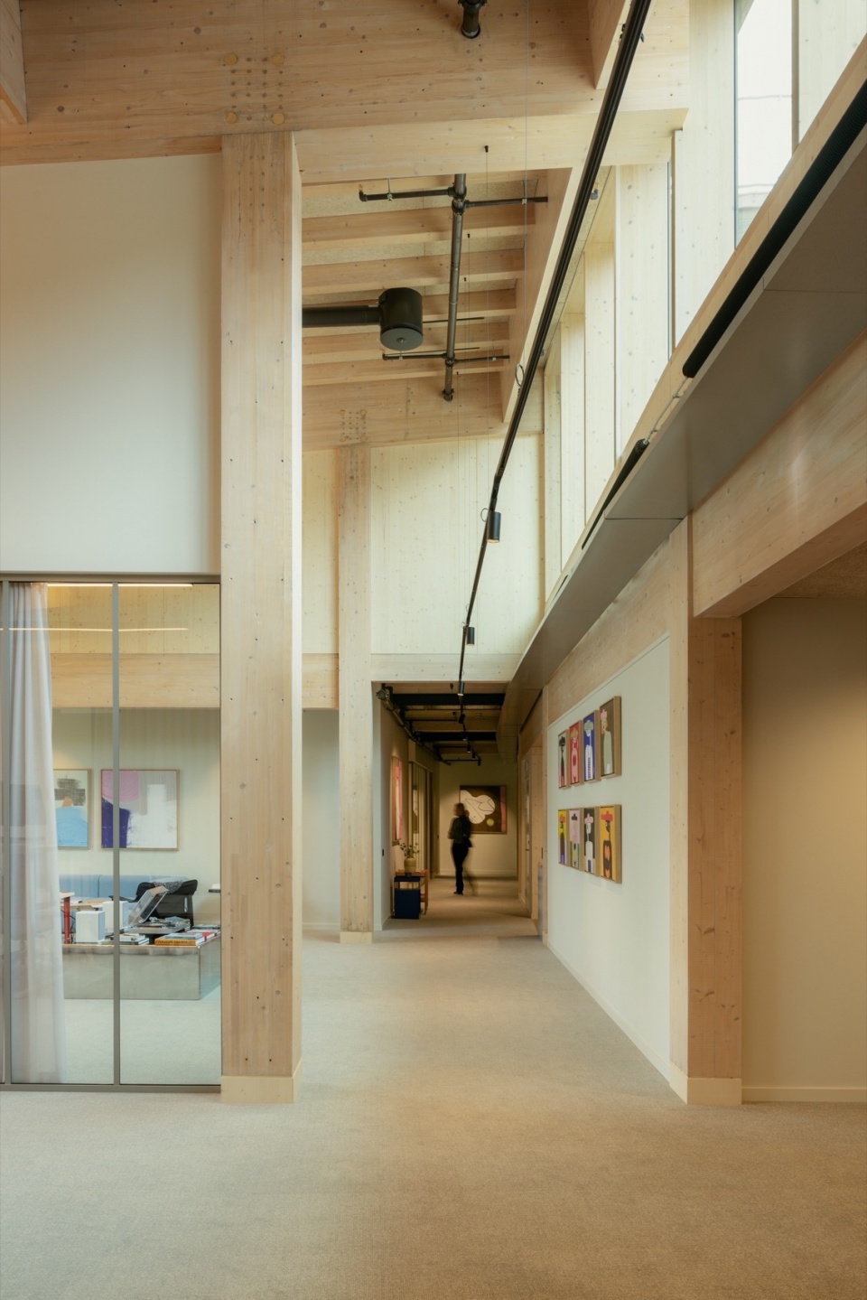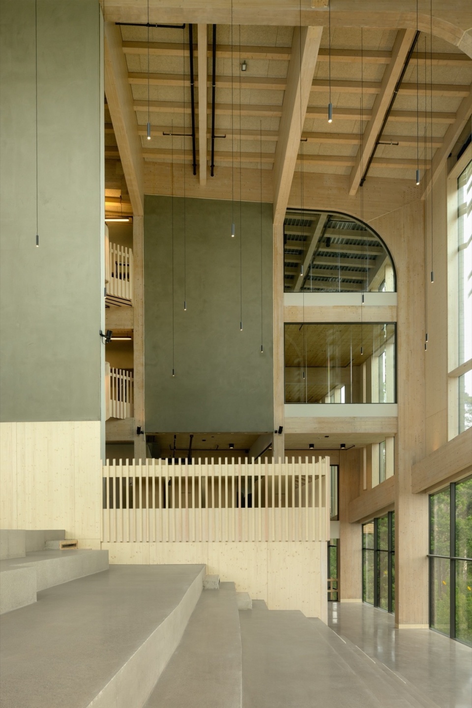 The top two floors draw inspiration from the surrounding trees, with glulam and laminated timber structures visible on the interior surfaces. The entire structure is framed by large glass panels with strategically placed patterns that create a play of light reminiscent of sunlight through treetops while also minimizing heat load and the need for sunshades.