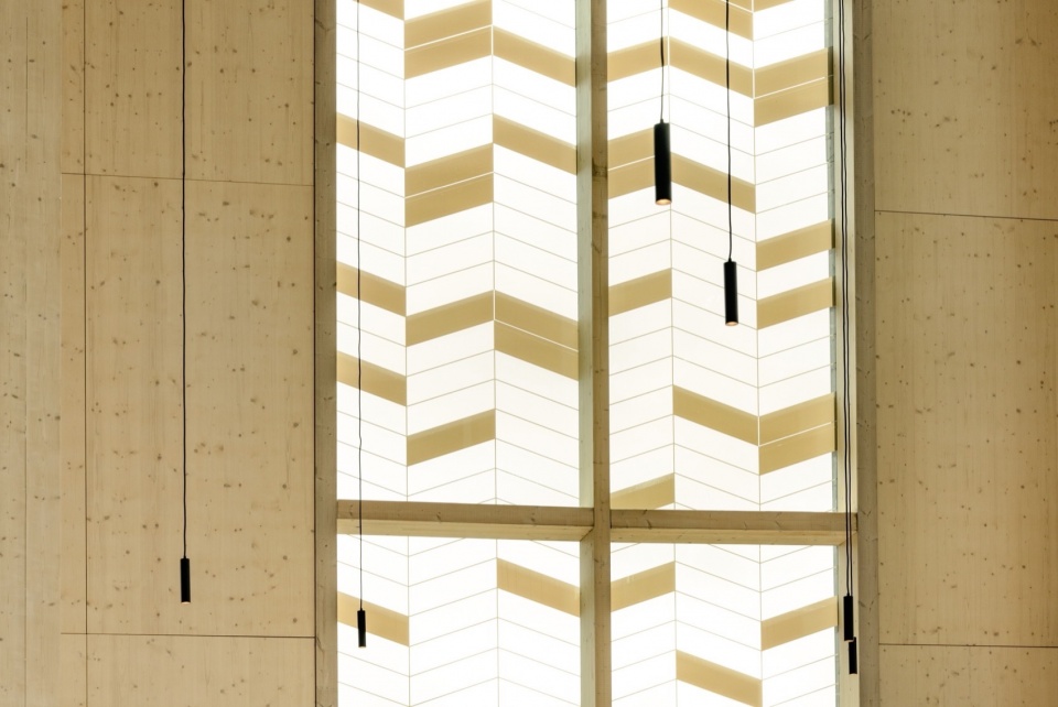 建筑的顶部两层从周围的树木中汲取灵感,内饰表面可见胶合木和层压木结构。整个结构被大型玻璃面板框架包围,面板上的精心设计图案创造出类似阳光透过树冠的光影效果,同时最大限度地减少热负荷和遮阳需求。