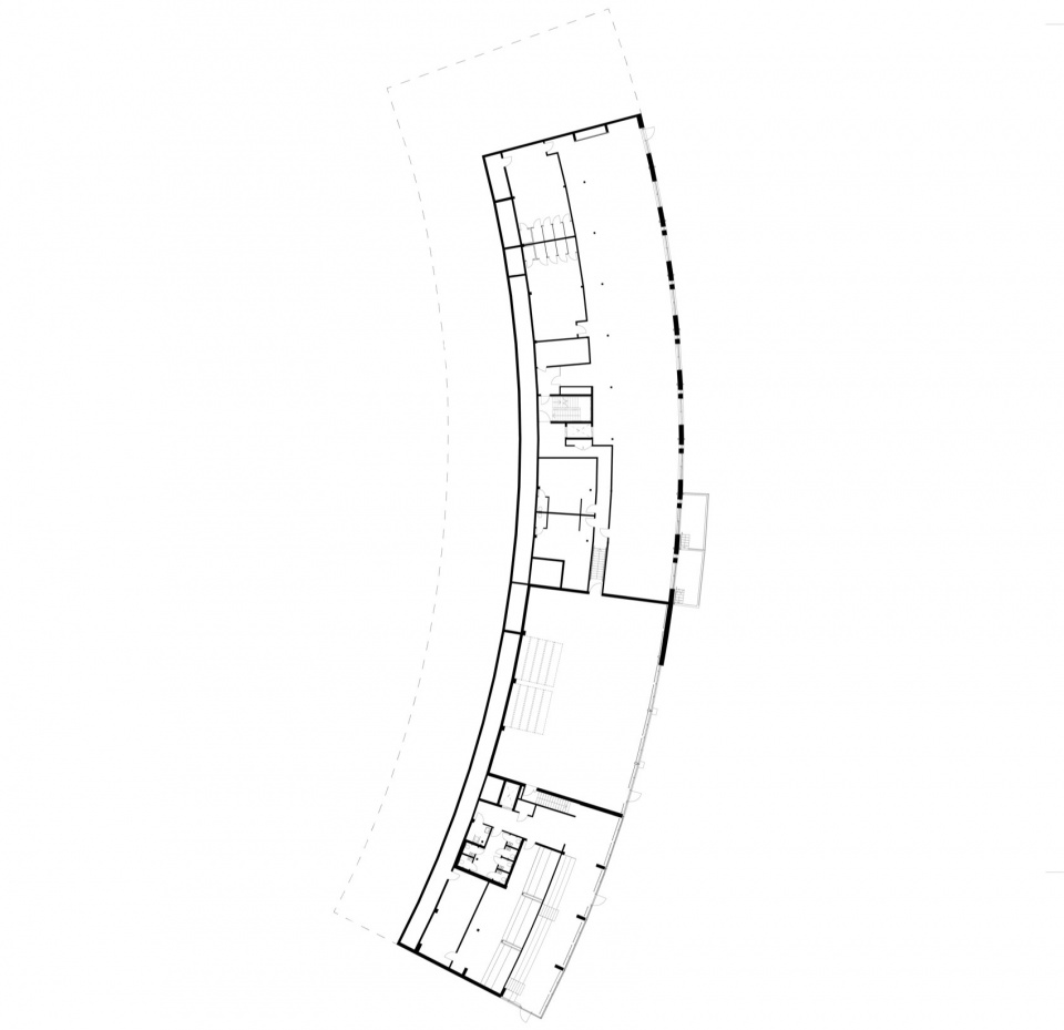 建筑的两层底部嵌入岩床,属于石材的世界。这里使用混凝土和石材地板,并设有一个中央开放的中庭,贯穿建筑的所有楼层。这片宽敞、慷慨的空间将承办音乐会和表演,或仅提供一个交谈和休息的地方。它也可以租用于私人活动。座位区延伸到建筑外部,形成一个户外剧场,俯瞰湖泊,突出自然与开发的交汇点。