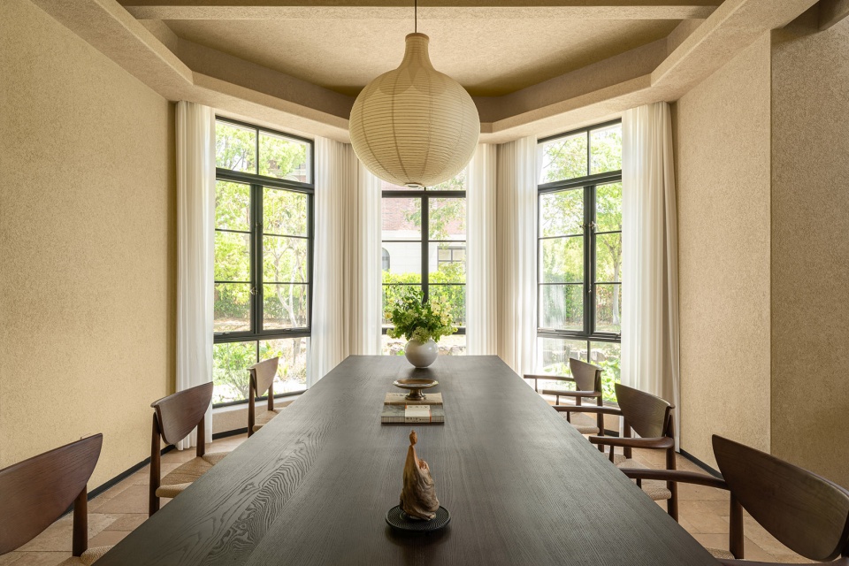 吃茶去,在这个家随处可见。一楼有独立围合吃茶的榻榻米,二楼卧室里有吃茶的小几,三楼的小茶室有一整面的落地窗,可以遥看人间四月芳菲尽。 别墅的地下一层,因其潮湿的缘故,常用作藏酒或储物。这里的地下空间,成为主人独处、冥想的秘密花园。土墙的肌理有岁月打磨的痕迹。卵石铺路,赤脚踩上一条隐秘的小道,在旁边的木地板上闲坐小会儿。到了下午,天光开始眷顾到这里。静坐、喝茶、供养……推开门走向世界。关上门,便走向了自己。