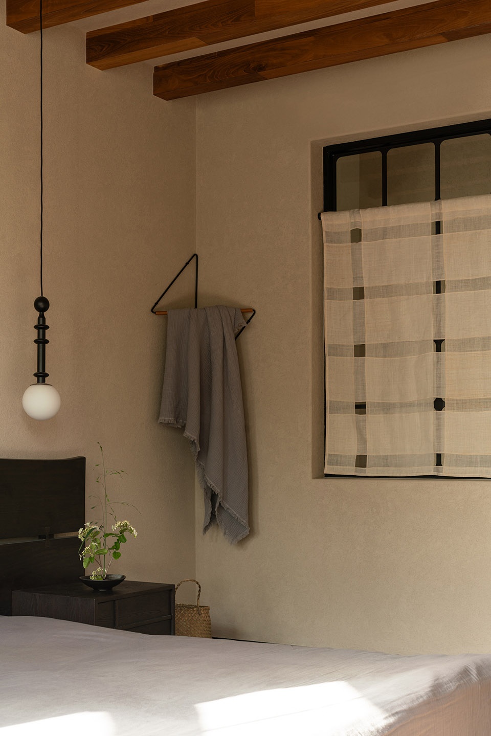这里是理想中家的样子。主人的意愿,是在这里过上简单有序的生活。也希望在有限的预算内更多释放给设计,而非多余或过度的材料上。我们选用硅藻泥、水洗石和木地板这些环保且常见的材料构建开放、隔而不断的主体,留出大面积的窗景与自然交互。吊灯、窗帘、藤编的座椅,是宣纸上的素色。实木的茶几搭配同样素白色的陶艺花器,在春去秋来中,侍候青青翠竹、郁郁黄花。