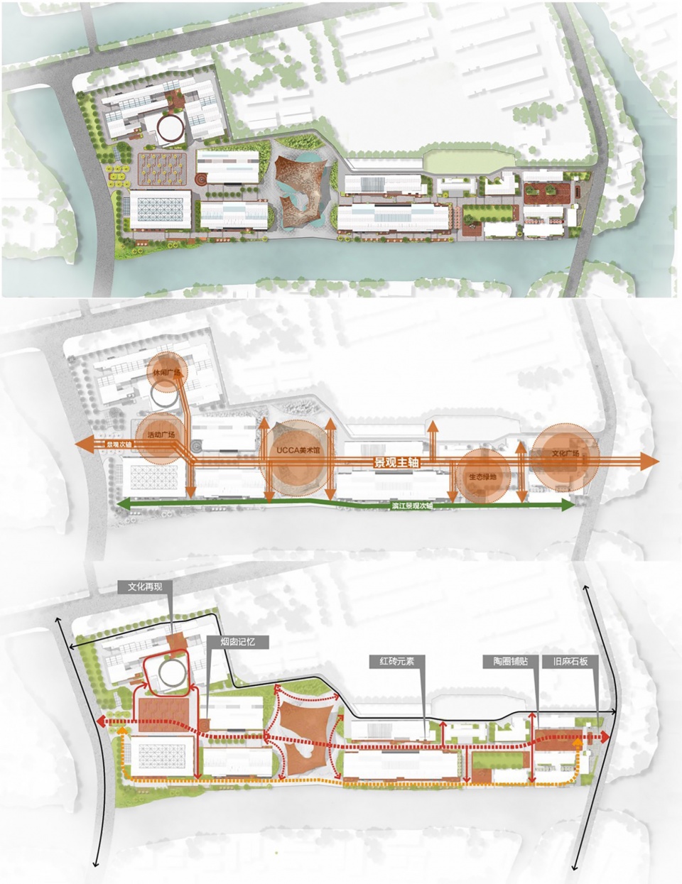 基于对场地历史脉络与空间肌理的系统性梳理,设计确立了以工业遗产为空间叙事基底的总体策略。围绕UCCA陶美术馆打造东西景观主轴与滨江次轴,形成连贯的游览路径。通过增设过渡空间作为叙事节点,让游客在移步换景中体验紫砂技艺与千年文化,实现文商旅融合,营造出”可观、可感、可游、可居”的沉浸式陶文化场域。
