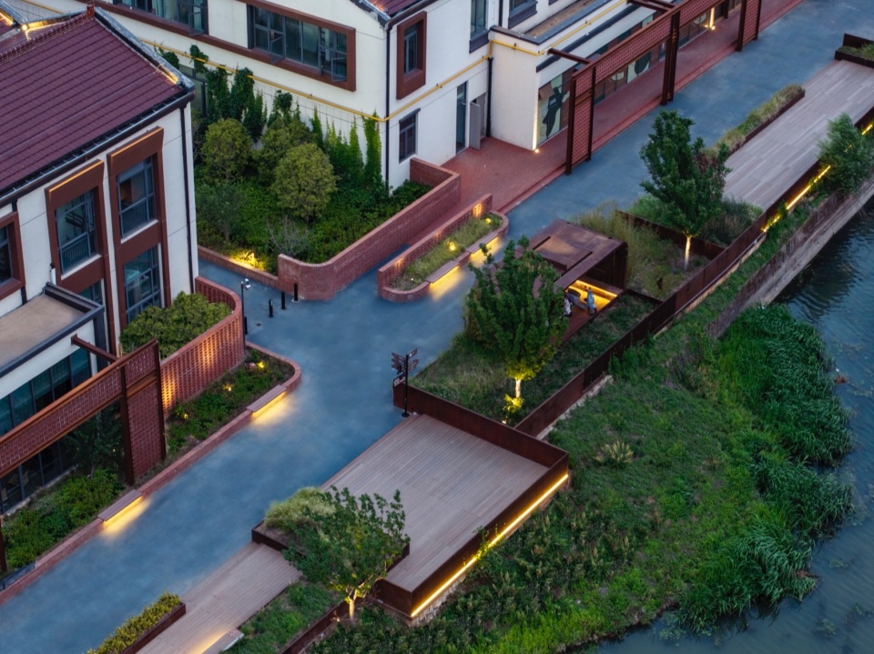 设计通过建筑与景观的有机融合,巧妙平衡了生态保护、历史延续与公共活力。在保留沿河原生自然界面的基础上,通过滨水露台的错落布局适度拓展步行空间,巧妙增强了公共区域的通达性与游憩舒适度。