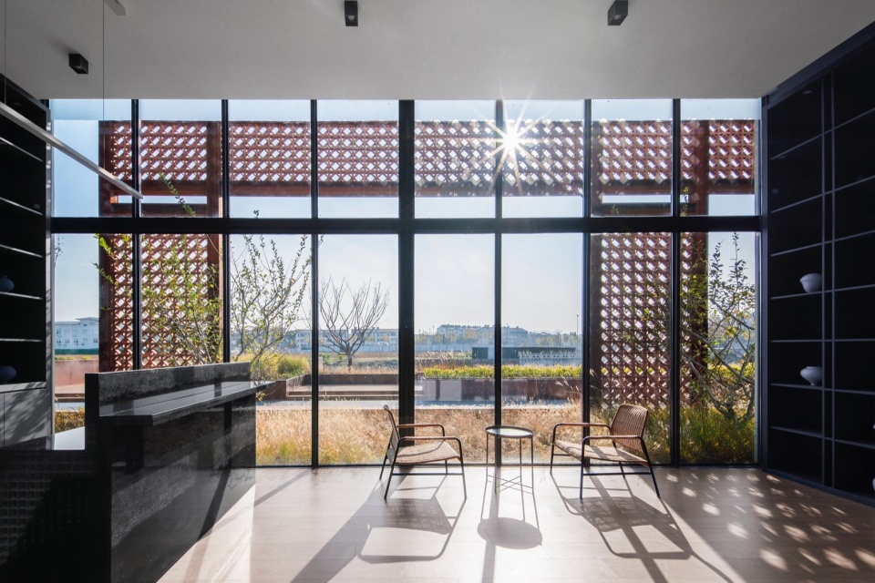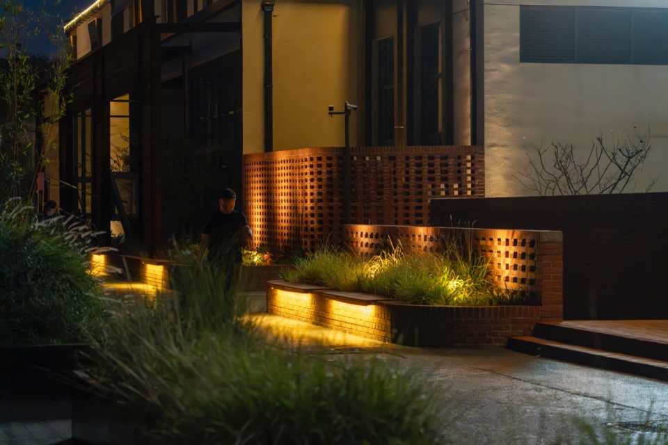 面对原有建筑立面单调的现状,创新性地采用工业遗存与本土材质相结合的解决策略:以工字钢梁构建结构性骨架,外置传统陶花砖幕墙系统,并精心配置多层次植被。这种复合式处理手法形成了虚实交织的立体韵律——钢构骨架勾勒出工业记忆的轮廓,陶砖幕墙以其特有的透光肌理与植被相互映衬,在阳光变幻中演绎出动态的光影交响,既实现了建筑与景观的有机对话,又通过材质语言的创新组合,在延续工业历史脉络的同时,塑造出富有生命力的内外过渡空间。